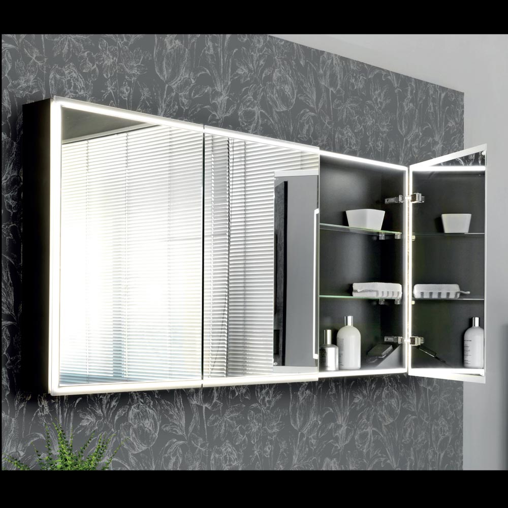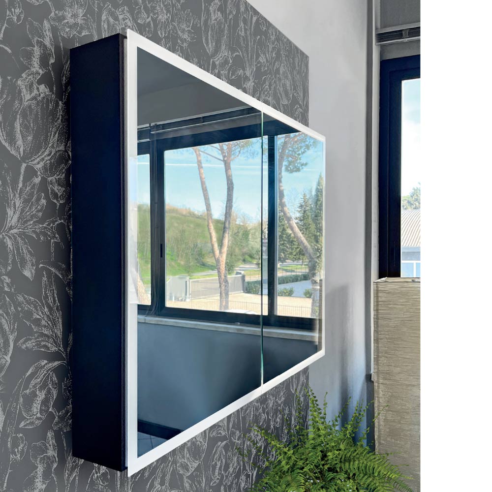De dubbele spiegeldeuren openen en onthullen een ruime interne ruimte, ideaal om al uw persoonlijke verzorgingsproducten georganiseerd te houden. Het LED-licht benadrukt niet alleen het design, maar zorgt ook voor functioneel licht, waardoor het perfect is voor make-up, huidverzorging of als extra verlichting in de badkamer.