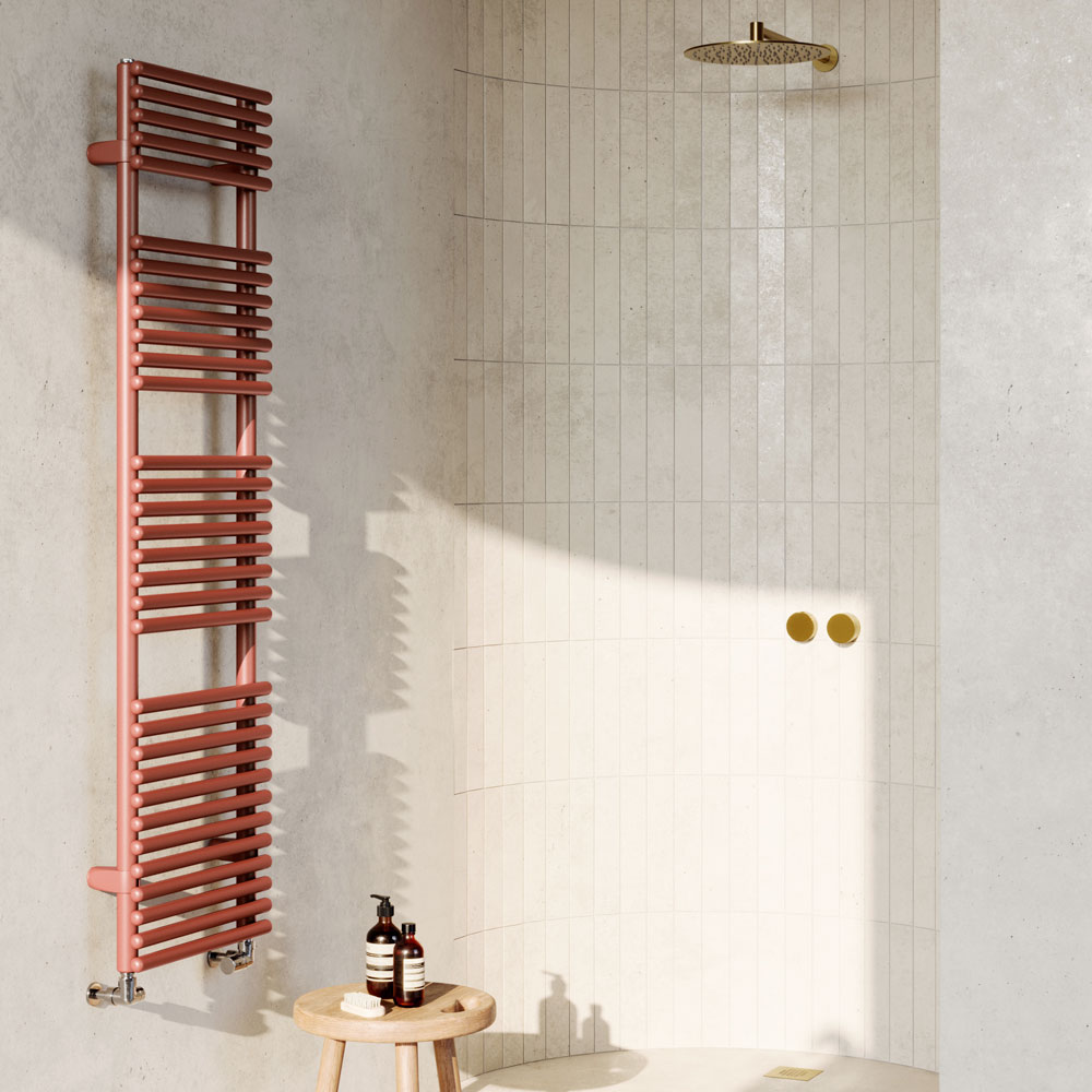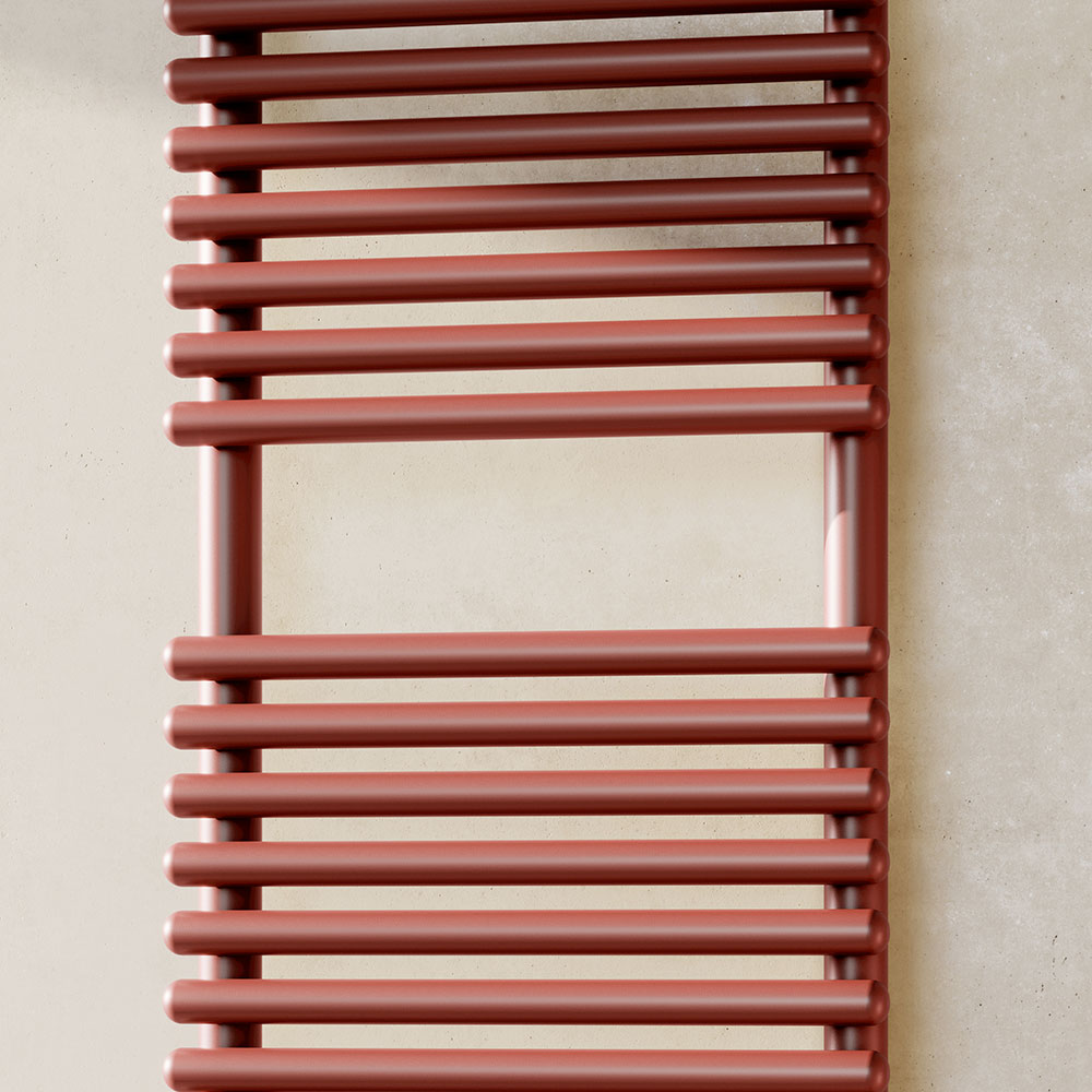 Fleur uw badkamer op met deze roestkleurige handdoekwarmer , een waar symbool van design en bruikbaarheid . De verticale lijnen en kleur zijn niet alleen ontworpen om uw handdoeken te verwarmen, maar ook om een vleugje gedurfde stijl aan elke kamer toe te voegen.