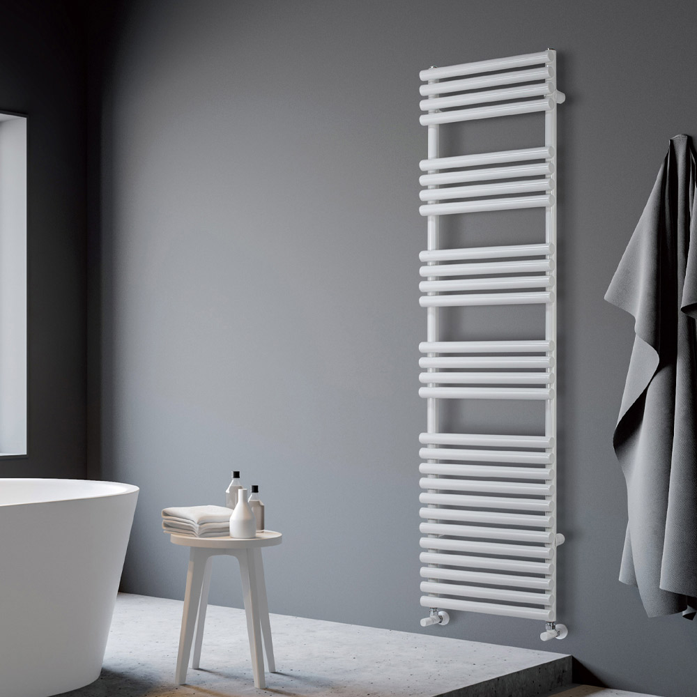 Hydraulische handdoekverwarmer van koolstofstaal met een hoogglanzende, zuiver witte afwerking, bestaande uit een reeks horizontale elementen met een diameter van 3,5 cm, gelast op verticale verdeelstukken met een diameter van 3,5 cm, volledig gemaakt in Italië, inclusief wandmontageset, ontluchtingsventiel en afsluitdop . Dit onderdeel wordt geproduceerd in de fabriek in Treviso, op slechts enkele kilometers van Venetië, wat de kwaliteit en efficiëntie van Made in Italy garandeert. Kennis en het streven naar innovatie in processen en producten vormen de basis en de waarden voor de creatie van een product dat geavanceerde technologie en design , esthetische schoonheid en functionaliteit combineert.