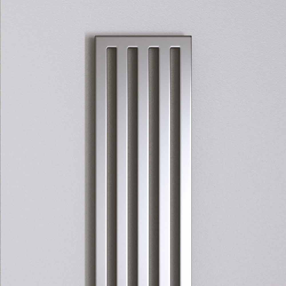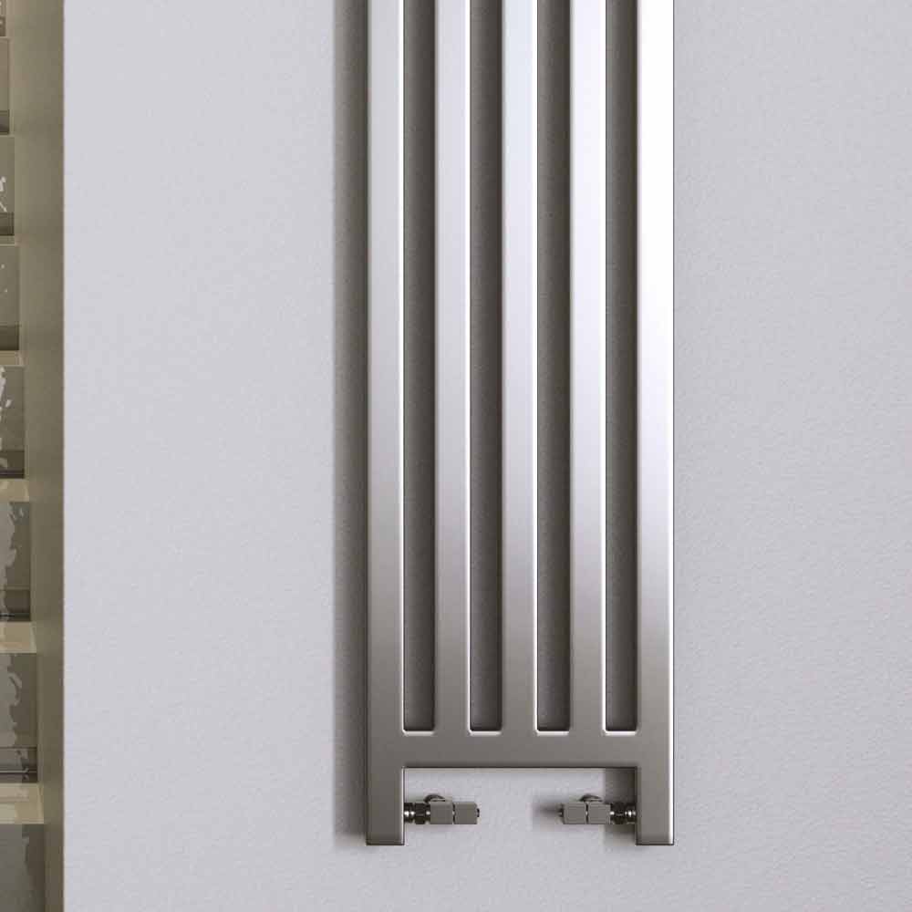 Chroomstalen radiateur, verticaal in de hydraulische uitvoering. Mix van materialen tussen verwarmingsstructuur en afdekplaten in een perfecte balans tussen esthetiek, functionaliteit, zorg en verfijning van detail. Met News Dress kleed je de omgeving waarin je leeft aan.