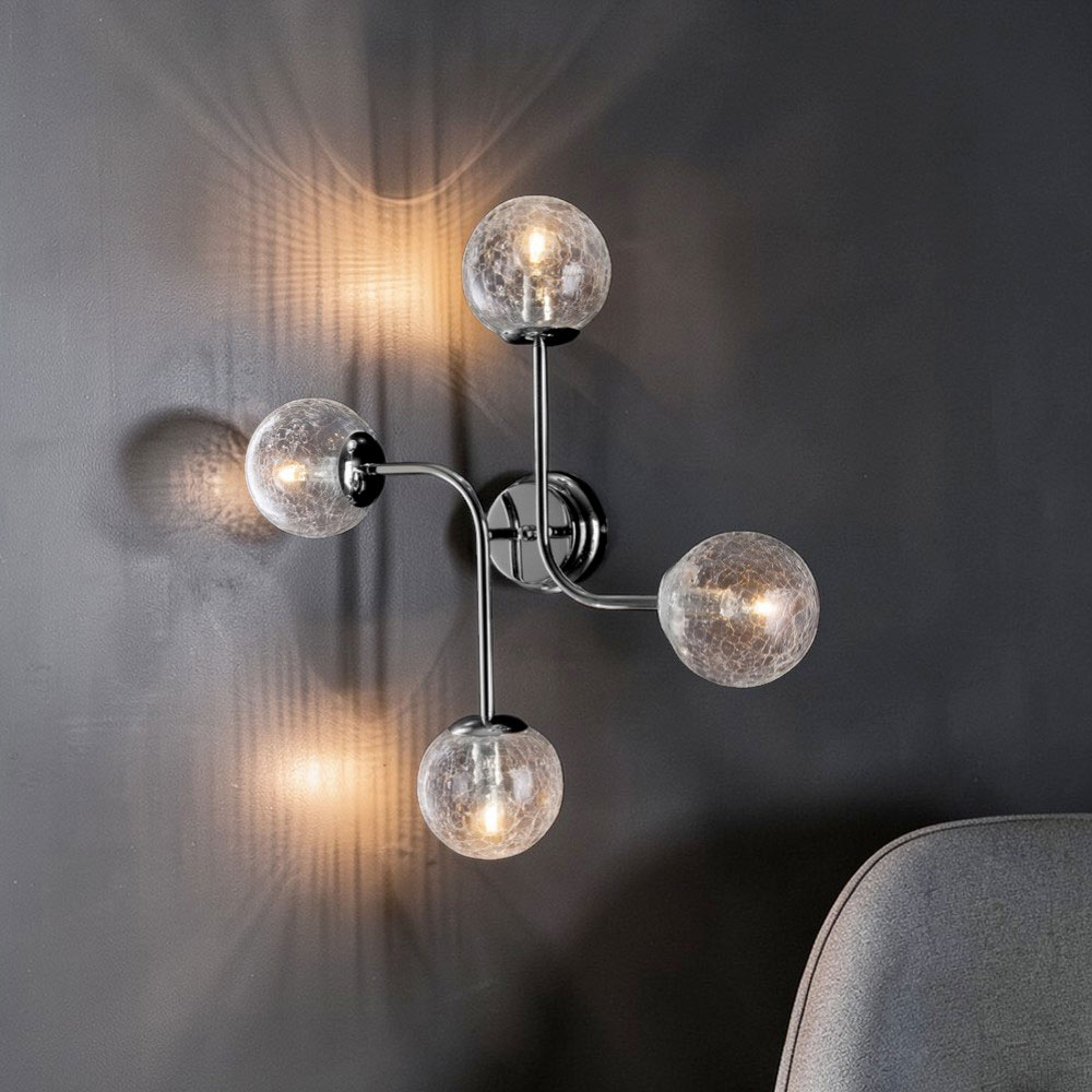 Eenvoudig, modern en visueel aantrekkelijk: deze design plafondlamp van gepolijst chroomijzer is een eigentijdse verlichtingsoplossing die ruimtes verfraait met ingetogen elegantie. De compacte structuur, met evenwichtige armen en bolvormige diffusers, creëert een verfijnd samenspel van volumes en reflecties dat diepte aan de ruimte geeft.