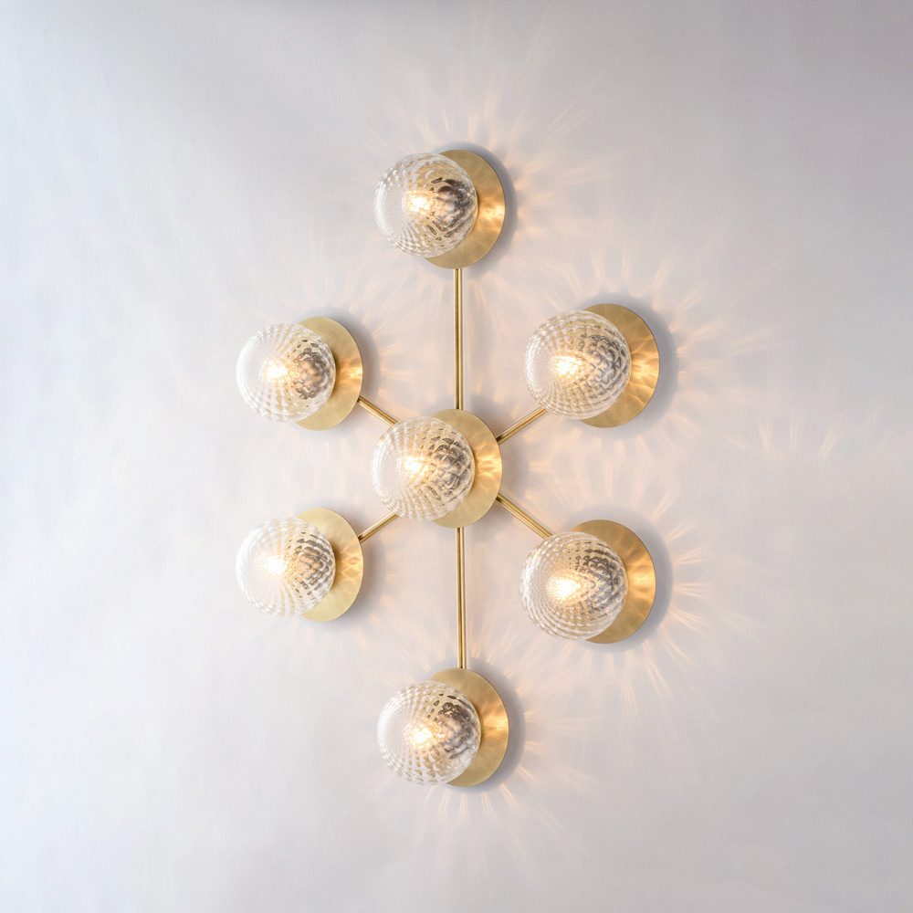 Dramatisch en eigentijds, deze handgemaakte ijzeren plafondlamp valt op door zijn dynamische en moderne vormgeving. De vertakte structuur bevat bolvormige glazen diffusers, die in een evenwichtig patroon zijn gerangschikt. Dit creëert een suggestief spel van licht en reflecties dat het plafond accentueert en de ruimte gelijkmatig verlicht.