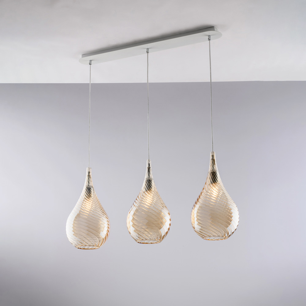 Elegant en functioneel, deze handgemaakte hanglamp met ijzeren rail en Pyrex-glas is een eigentijdse verlichtingsoplossing, ontworpen om ruimtes te verfraaien met balans en lichtheid. De drie sierlijke en verfijnde Pyrex-glazen diffusers hangen aan een lineaire rail die zorgt voor een gelijkmatige lichtverdeling en een sterke esthetische impact.