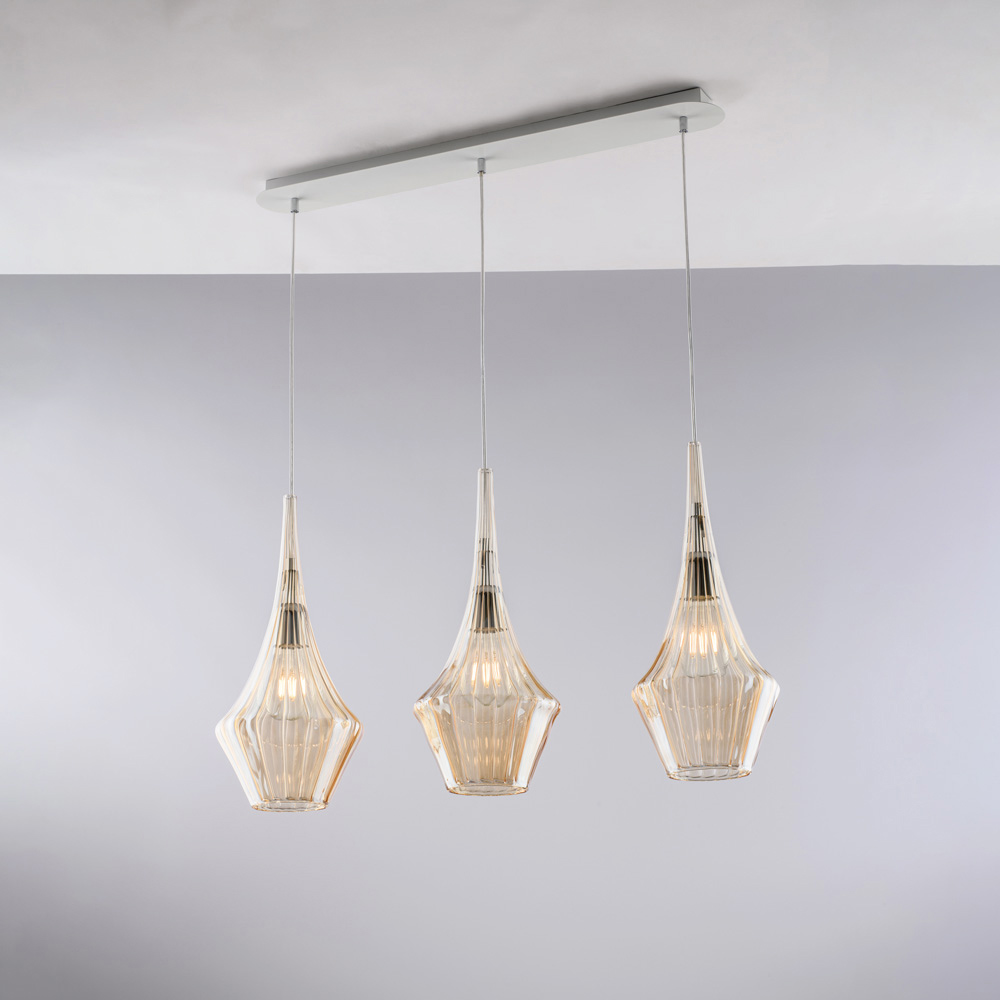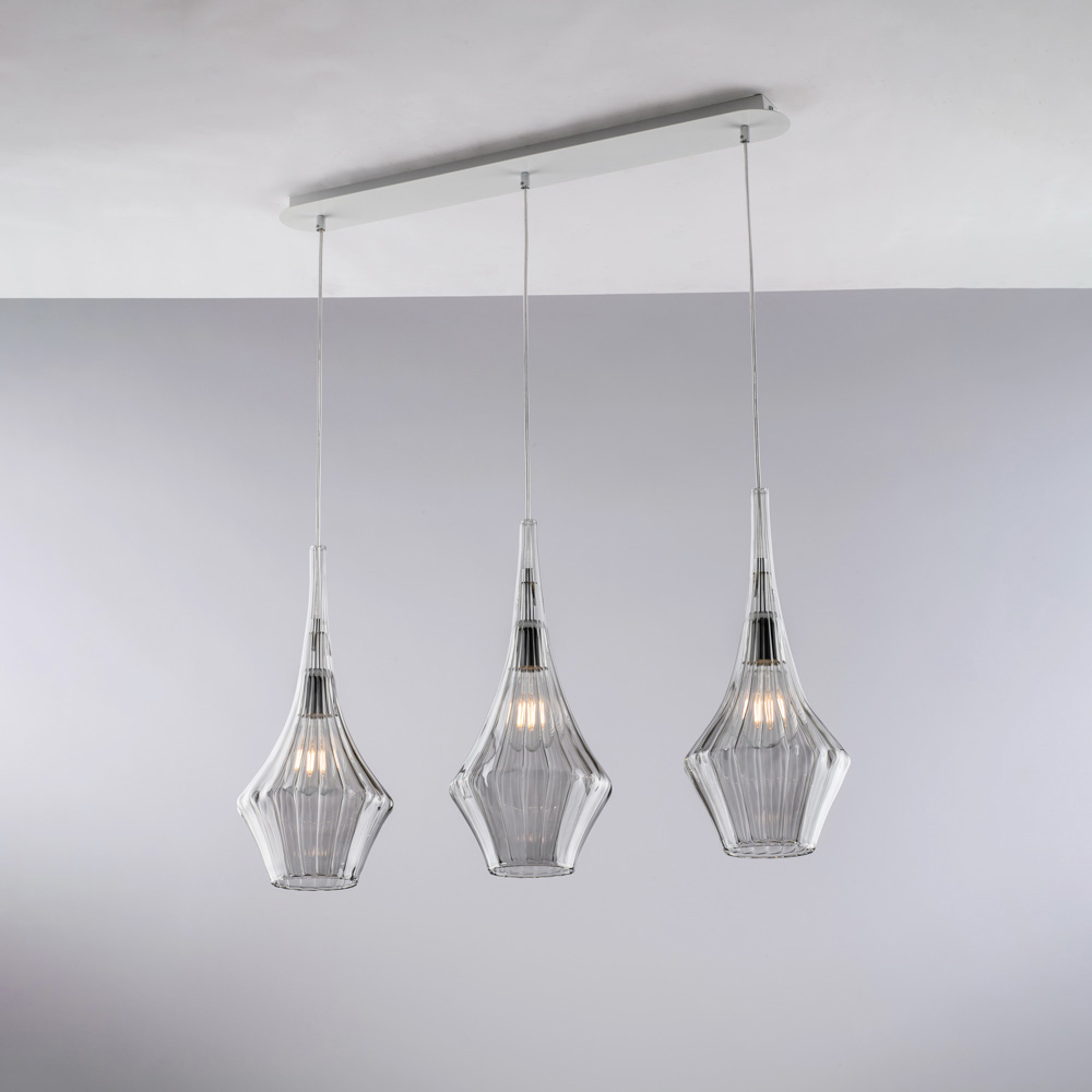 Deze gestroomlijnde en elegante, handgemaakte hanglamp met ijzeren rail en Pyrex-glas is een eigentijdse verlichtingsoplossing die ruimtes verfraait met balans en verfijning. De drie Pyrex-glazen diffusers , met hun facetten en harmonieuze vormen, verspreiden het licht gelijkmatig en creëren een heldere en verfijnde sfeer.