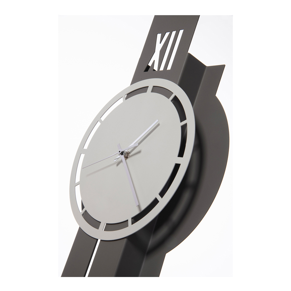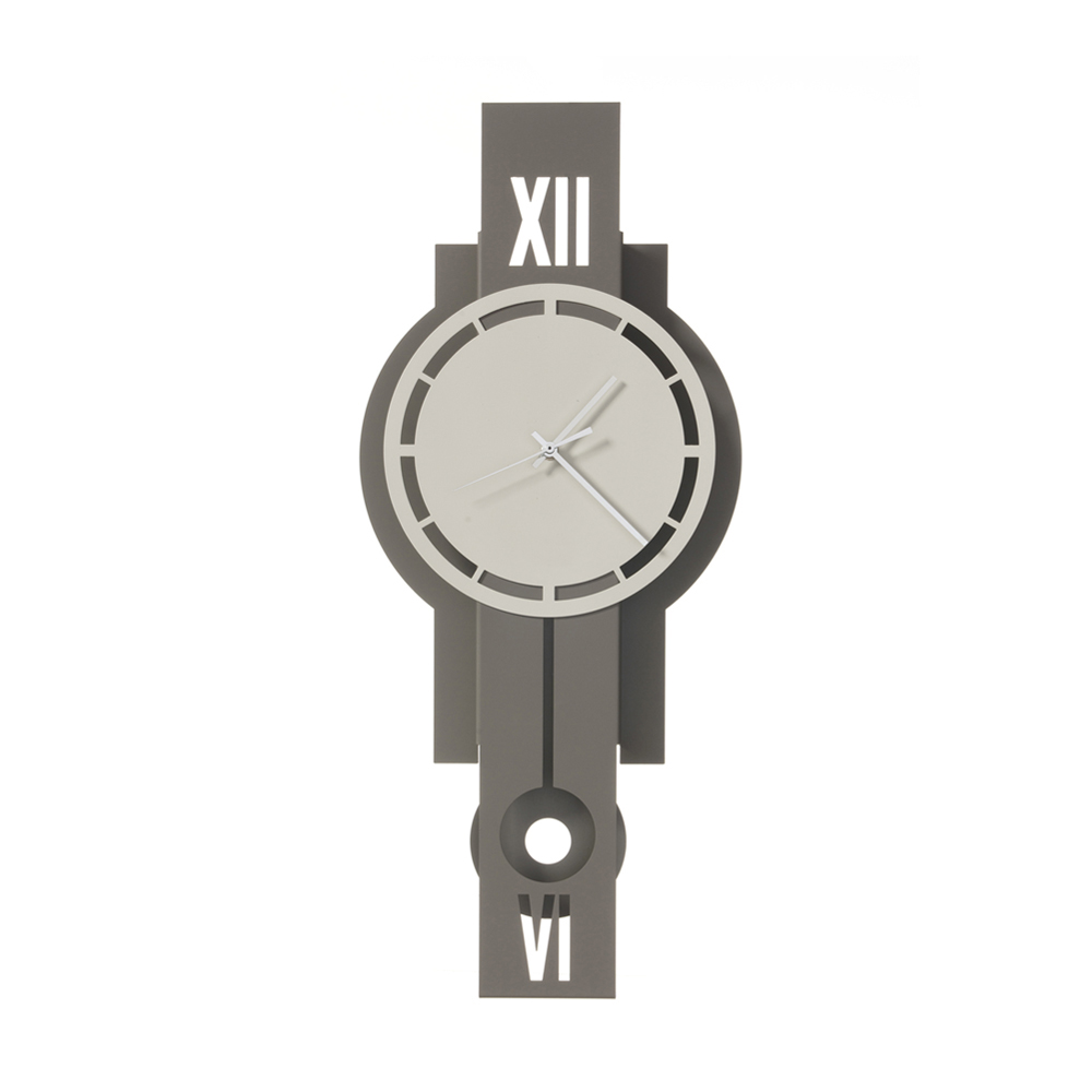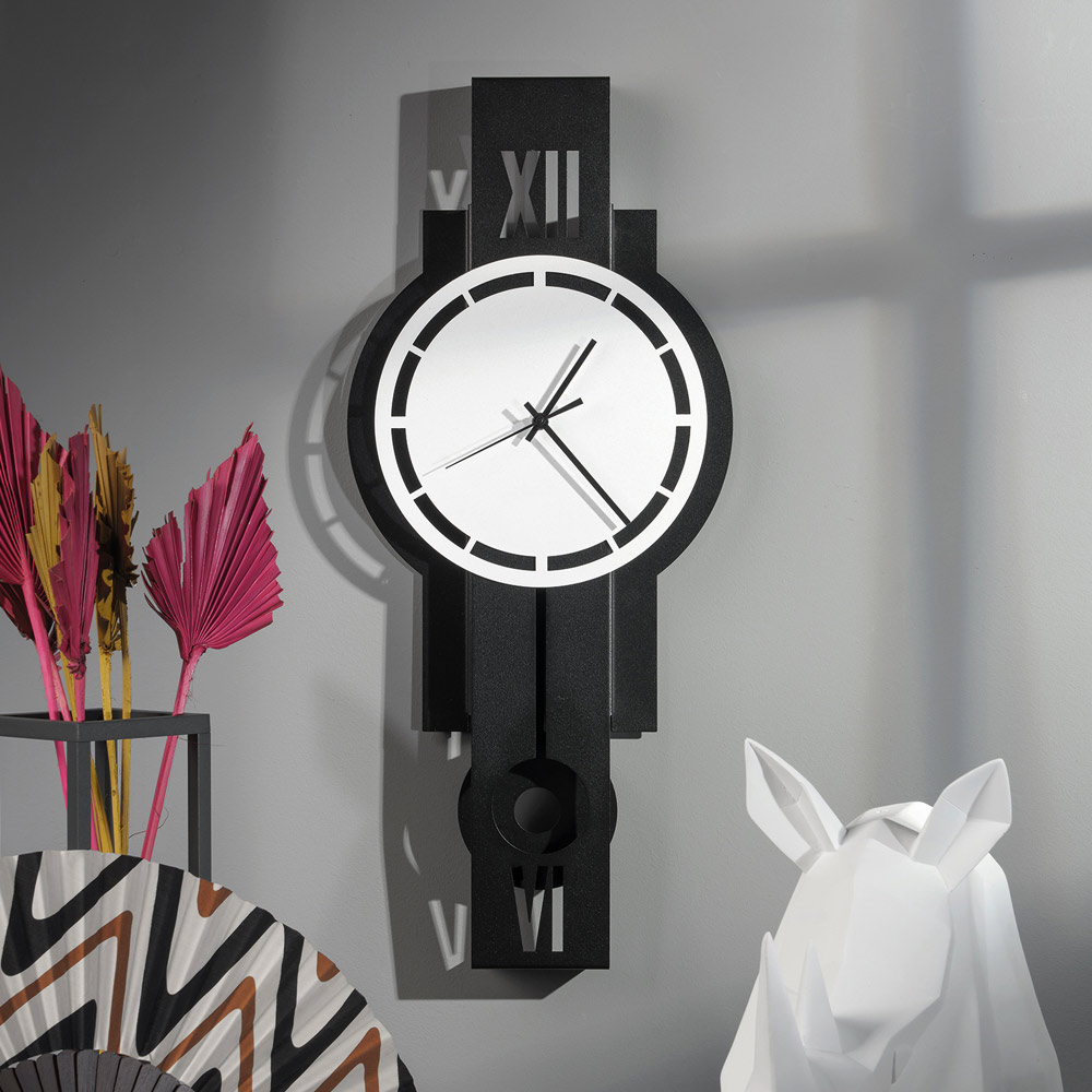 klok is voorzien van een slinger die een dynamisch element toevoegt dat met precisie en gratie zwaait, wat het verstrijken van de tijd symboliseert en dynamiek aan de muur toevoegt.