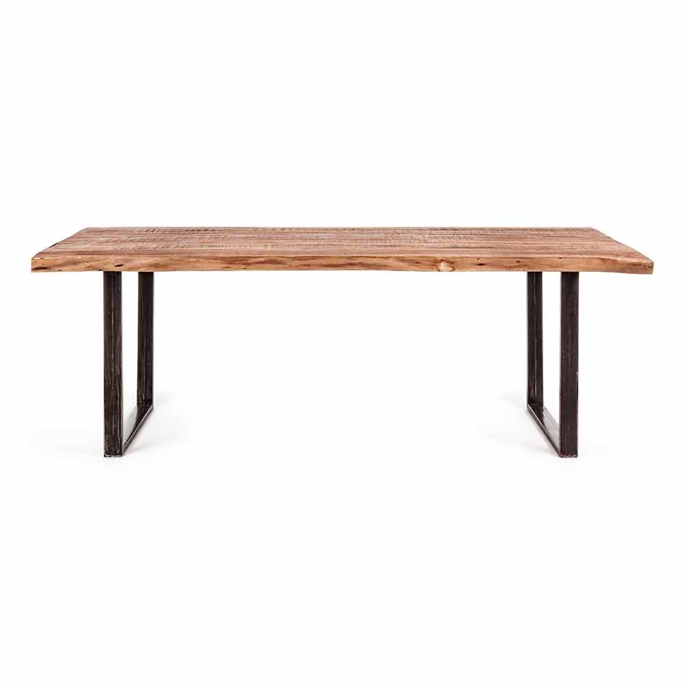 Eettafel in industriële stijl met acaciahouten blad en stalen onderstel.
