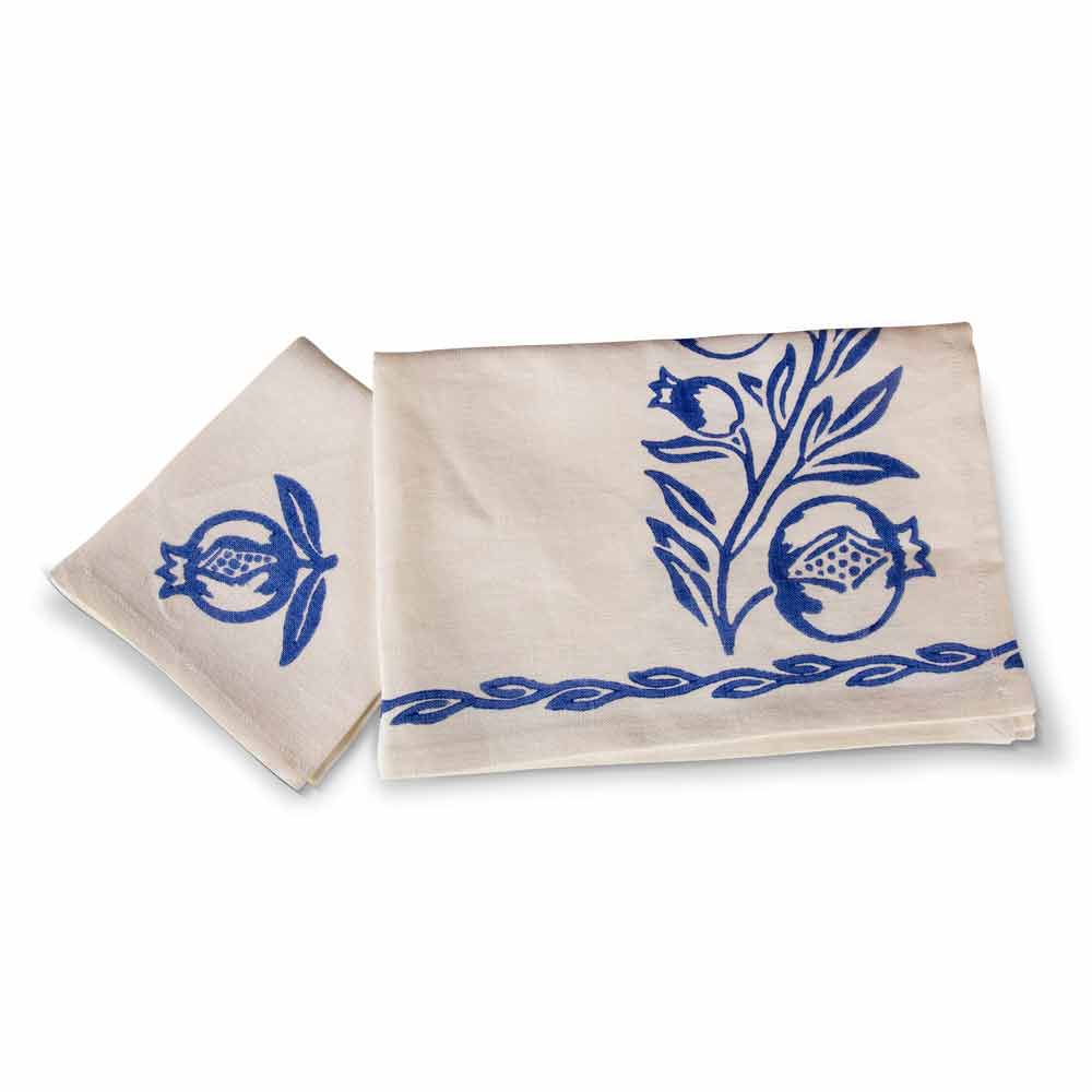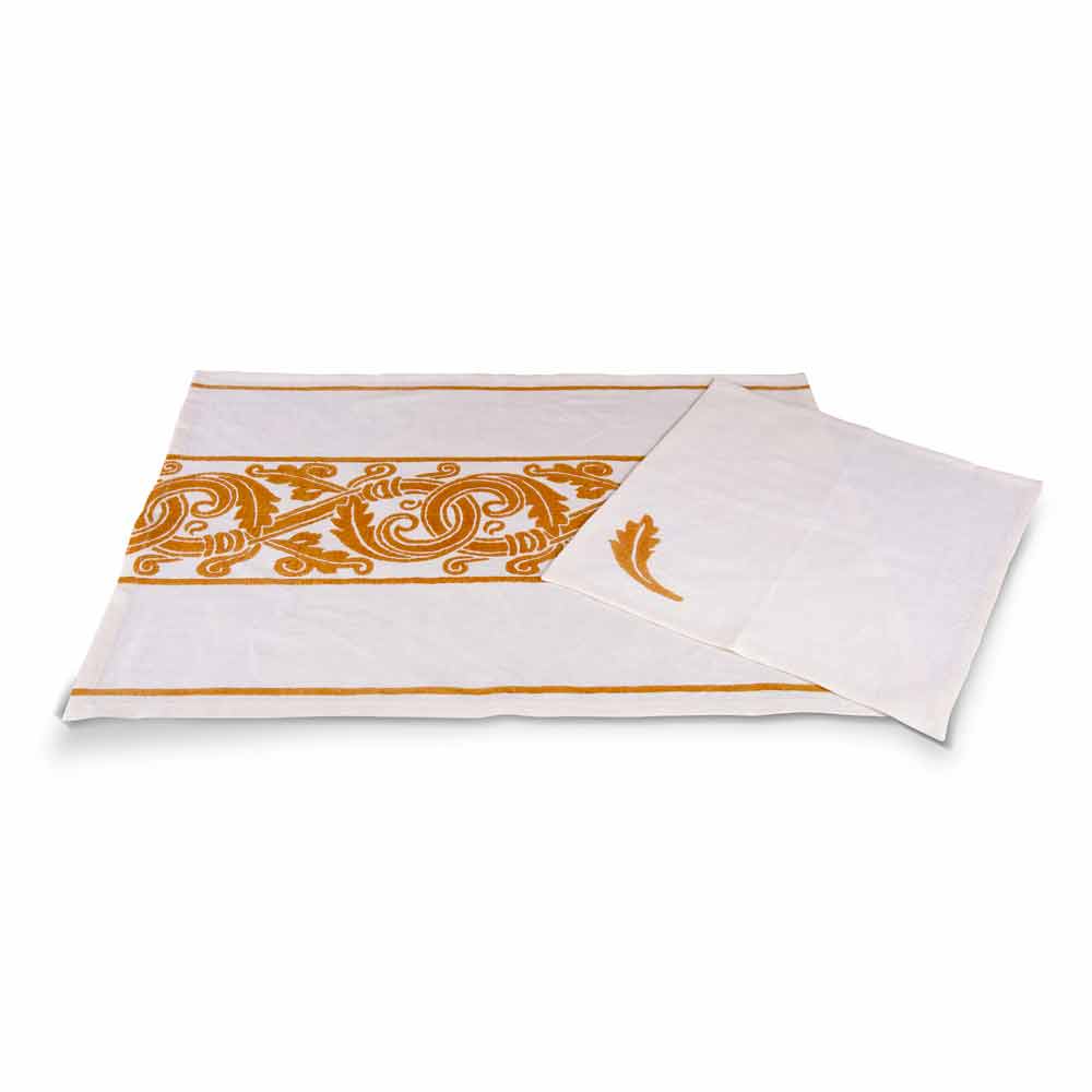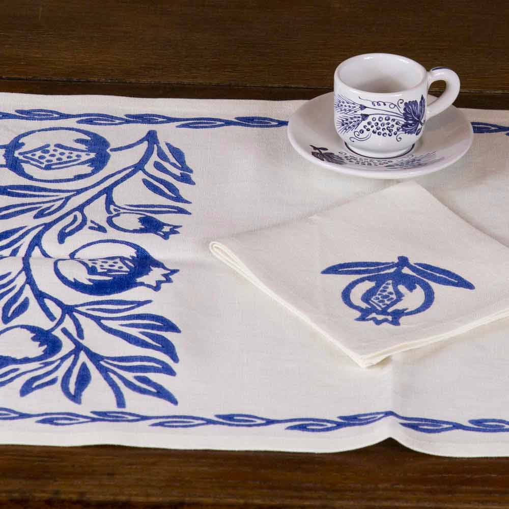 Ambachtelijk ontbijtservies (placemat en servet) gemaakt van puur linnen met artistieke print op met de hand gedecoreerde antieke stoffen, verkrijgbaar in drie varianten, een uniek stukje kwaliteit made in Italy.