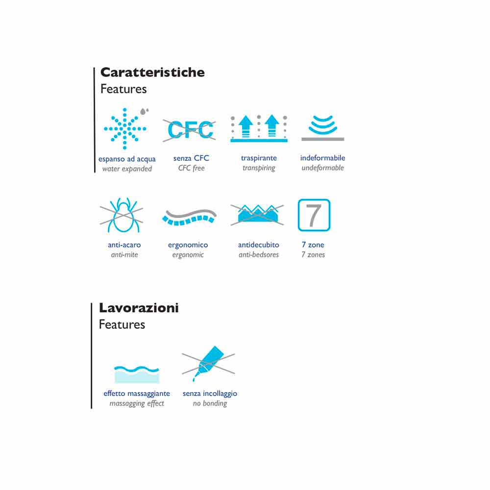 De beste transpiratie wordt ook gegarandeerd door het specifieke profiel en door de gaten die de Memory binden aan de "Natura" schuimlaag die het lichaamsgewicht correct en effectief ondersteunt, ook gevormd in het onderste deel om het gebruik van dit product op gemechaniseerde netten te vergemakkelijken .