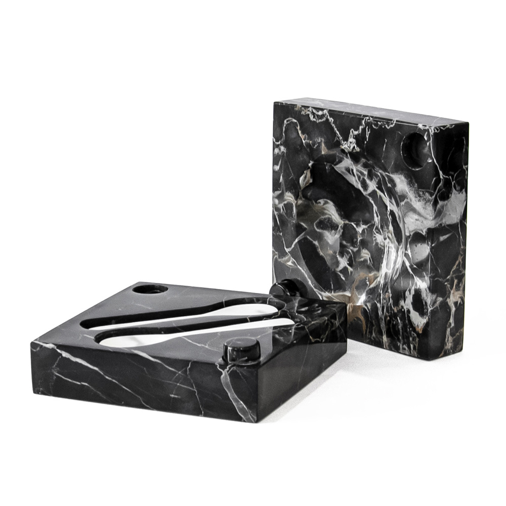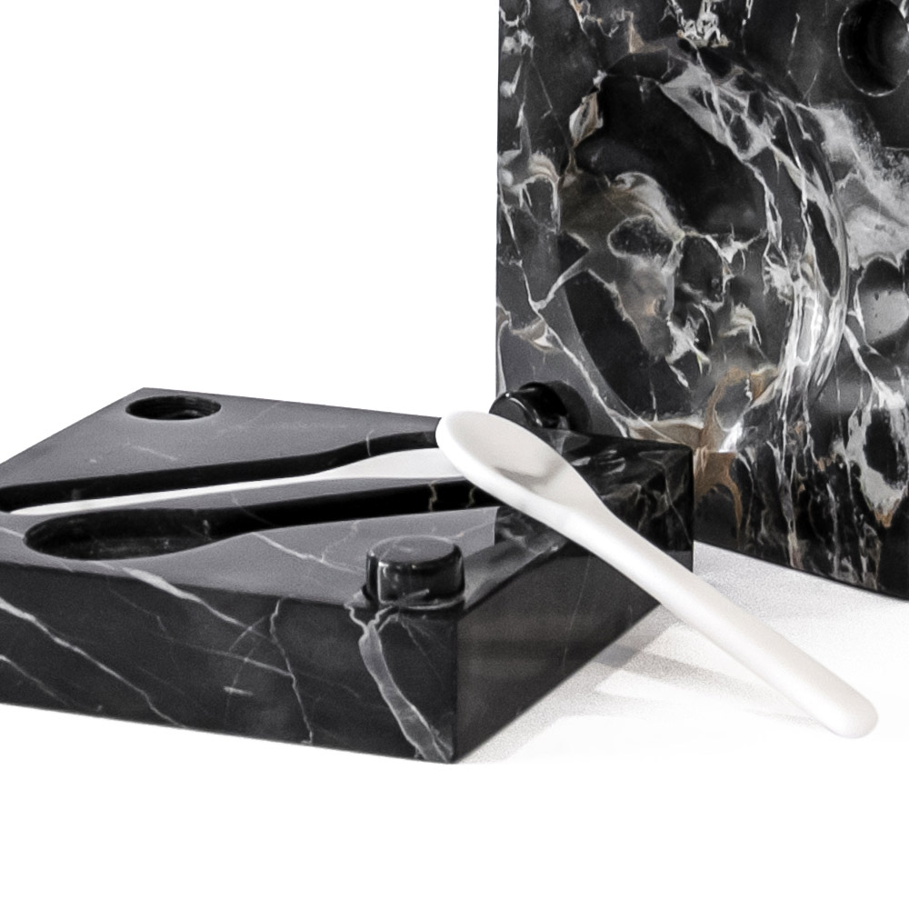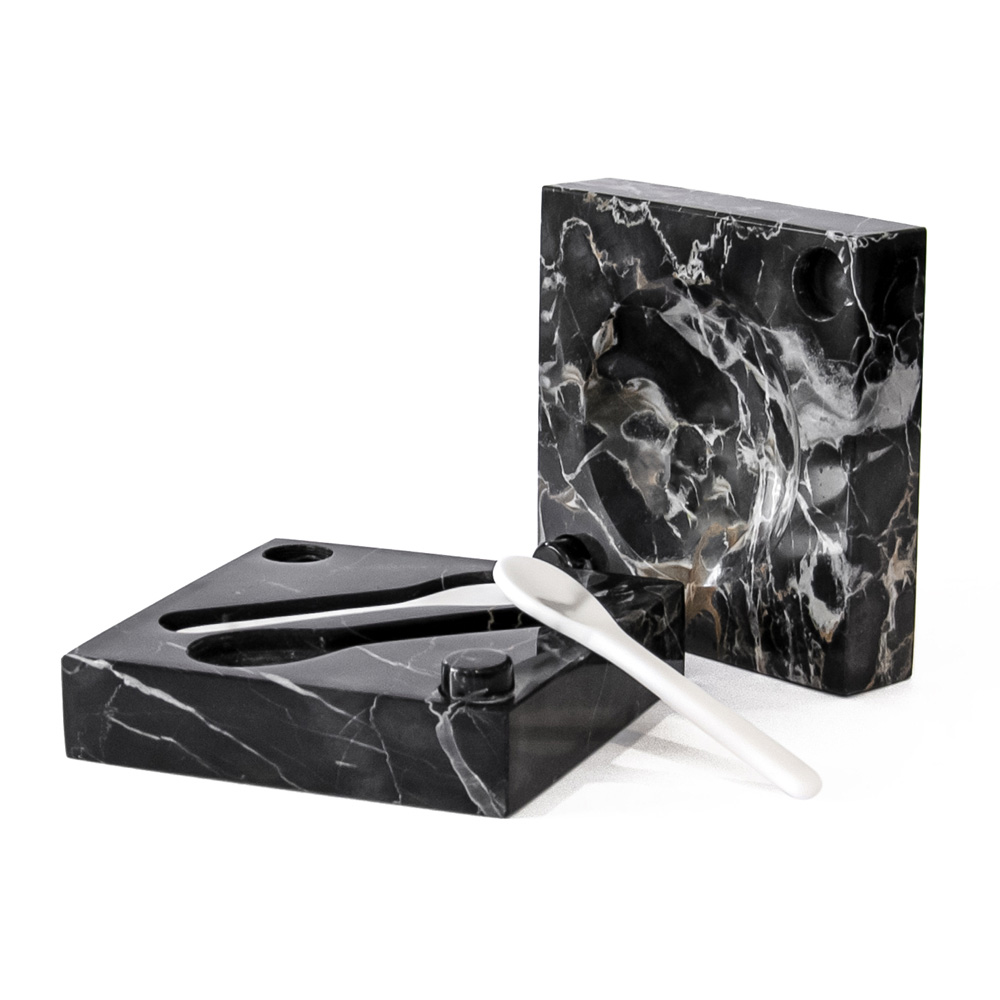 Portoro marmeren kaviaar houder met witte Carrara lepels, made in Italy design.