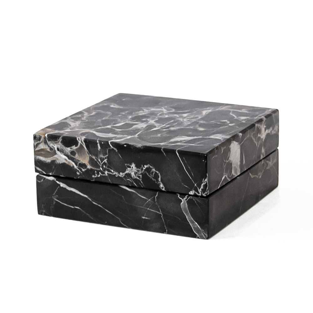 Deze kaviaardoos wordt gekenmerkt door zijn vierkante vorm en door de hoge elegantie en verfijning die het materiaal vrijgeeft waarmee hij is gemaakt: zwart Portoro-marmer.
