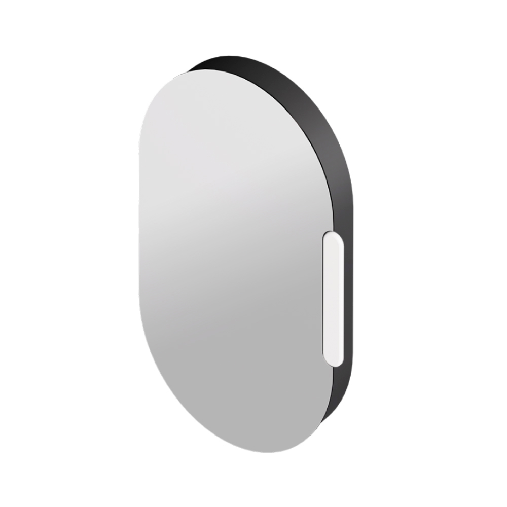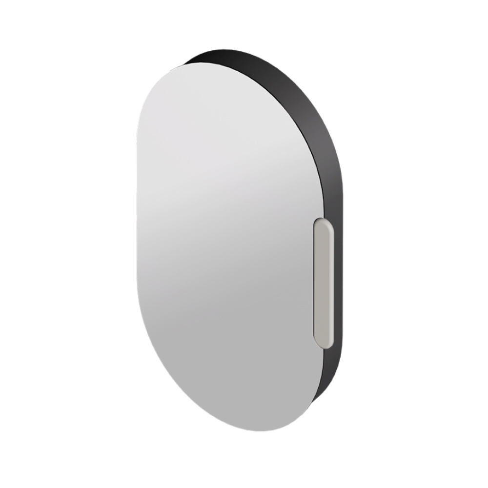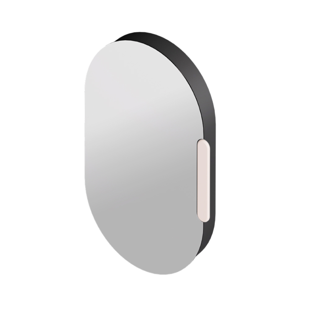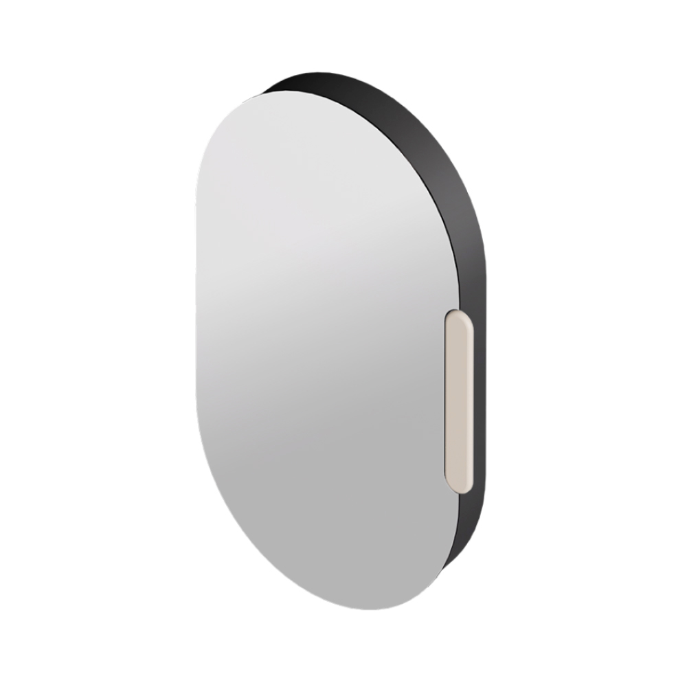 Deze ovale spiegel met keramische lijst is niet alleen een decoratief element, maar ook een slimme opberger : achter het reflecterende oppervlak bevinden zich praktische open vakken, ideaal om kleine dagelijkse voorwerpen elegant in op te bergen.