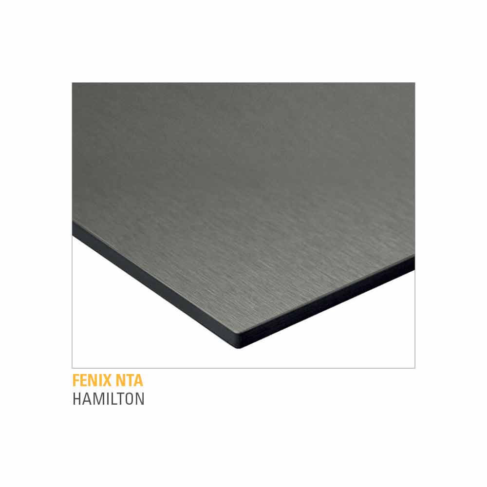 gelamineerd fenix blad (dikte 10 mm) voorzien van mdf steun (dikte 22 mm) en poten in zwart geanodiseerd