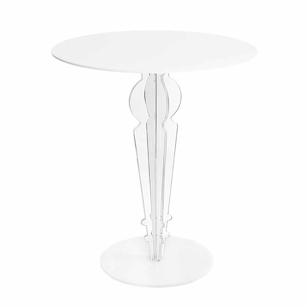 De kleine tafel van CLES is bedoeld als een herinterpretatie van de luxueuze kleine tafels uit de achttiende eeuw, met een enkele centrale poot. Het is gemaakt met een extreem zuiver PMMA acrylglas, met transparante poot en oppervlak in volledig witte kleur.