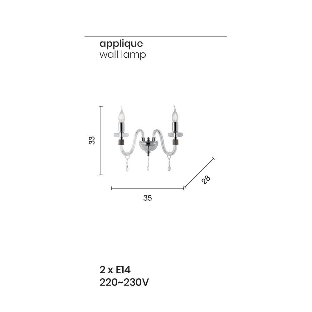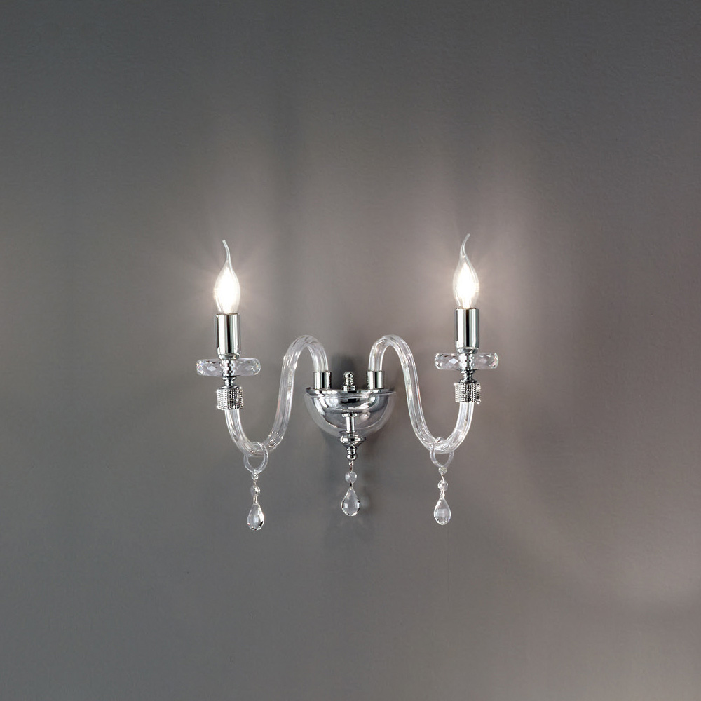 Deze wandlamp in klassieke stijl bestaat uit 2 gebogen armen van transparant glas, handgemaakt in Italië met een "rigaton"-effect, waarvan de uiteinden zijn omgeven door glitter in het metaal, evenals voor het centrale deel van de aanvulling, waar twee buizen cirkelvormige schijven ondersteunen de structuur afgewisseld met twee cirkelvormige schijven van verschillende afmetingen gemaakt van geslepen kristal.