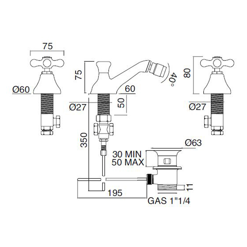 Bidet 3-gats mengkraan met afvoer in messing klassieke stijl, luxe made in Italy.