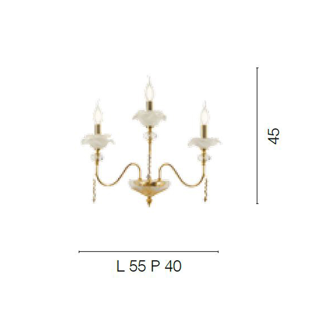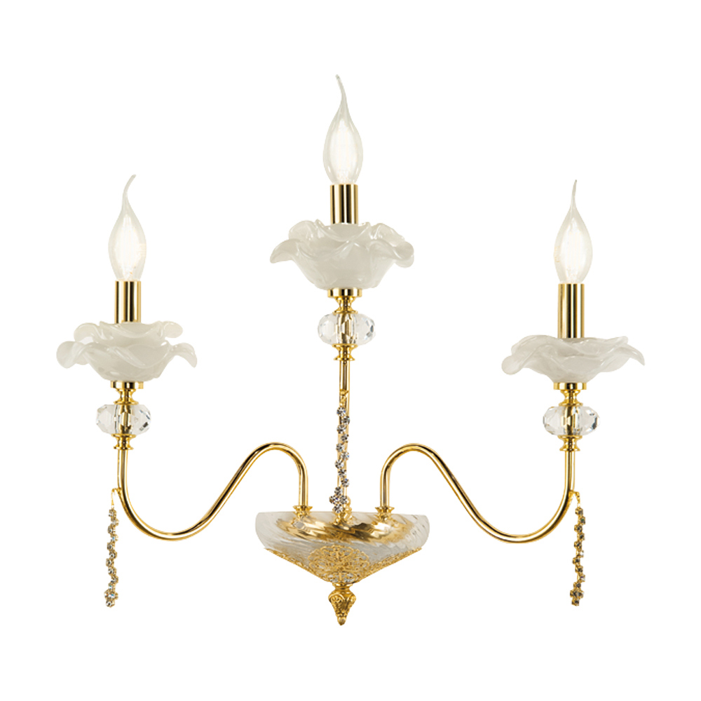 3 lichts wandlamp in handgemaakt glas met knoppen en kristallen druppels, luxe gemaakt in Italië.