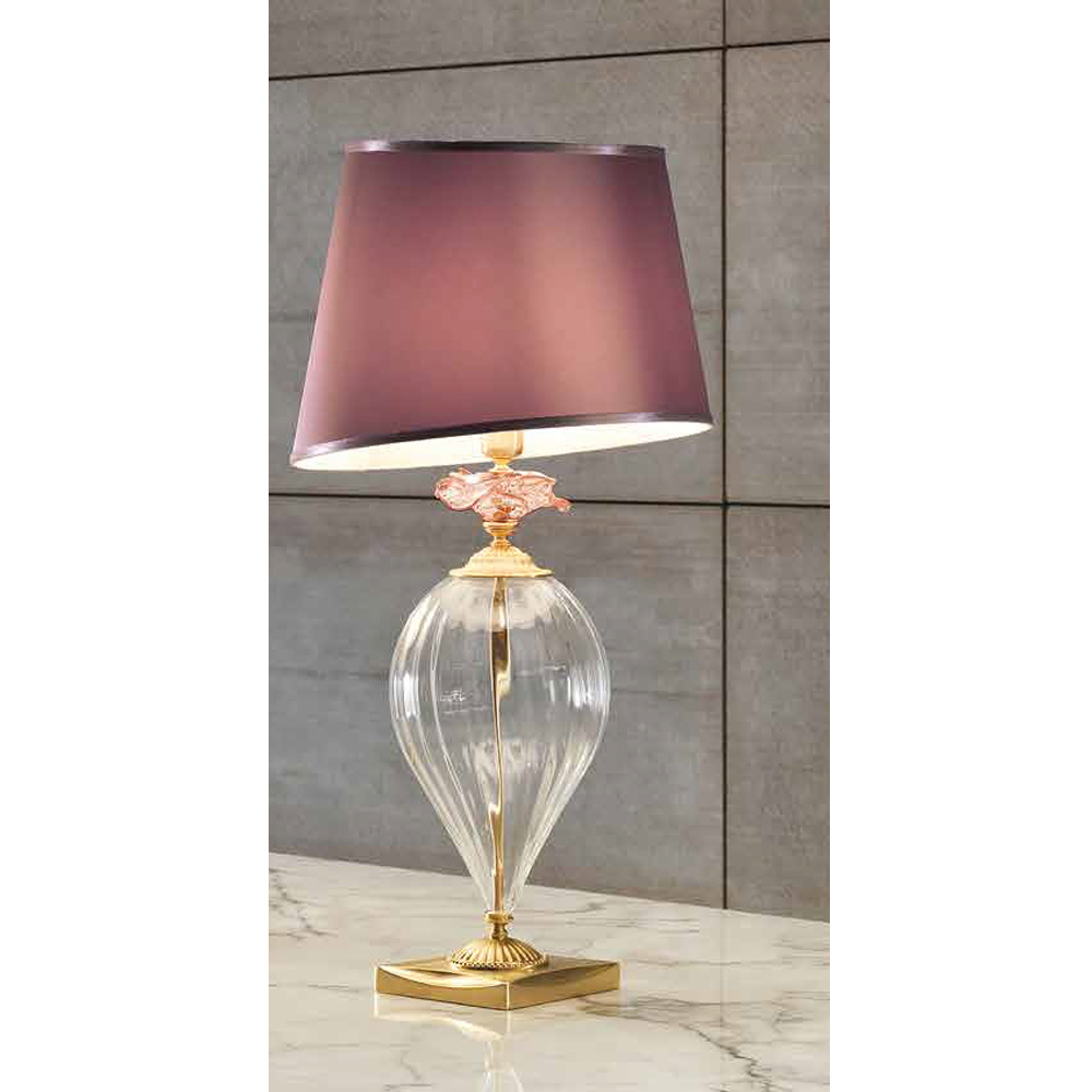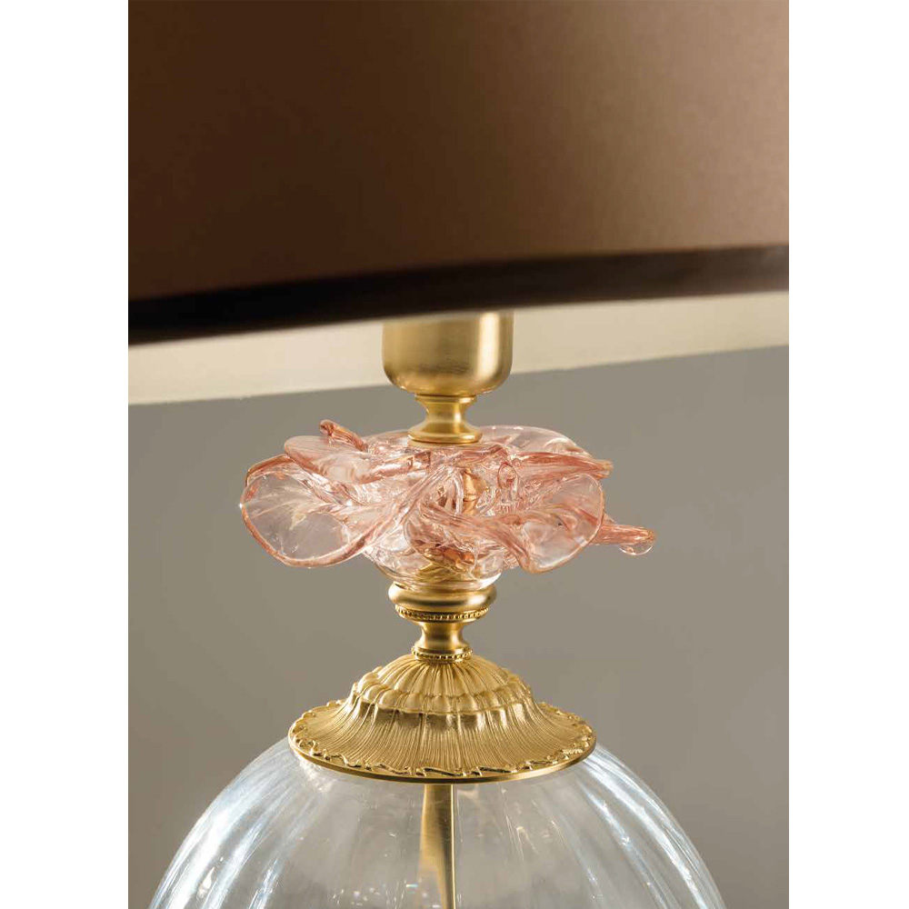 Beschikbare afwerkingen:- Lichaam in transparant glas - details in rosé glas - satijn goud metaal en champagne lampenkap;