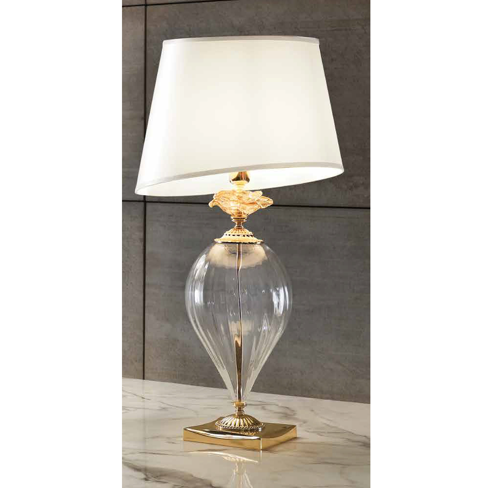 - Lichaam van transparant glas - details van honingglas - glanzend goudkleurig metaal en crèmekleurige lampenkap.
