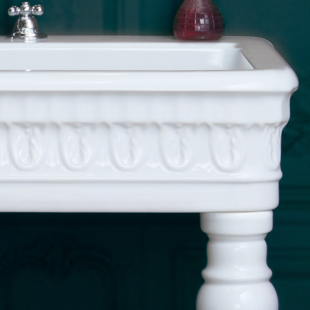 Consolewastafel in wit keramiek, handgemaakt door een 100% Made in Italy-productie . Majestueus en imposant, dit meubelaccessoire met een klassiek en verfijnd ontwerp komt voort uit de wens om leven te geven aan een oplossing die in staat is om perfecte harmonie te creëren, zowel in klassieke ruimtes als in omgevingen met moderne meubels waarbinnen het een ongewoon contrast vormt voor een creatieve en originele uitwerking .