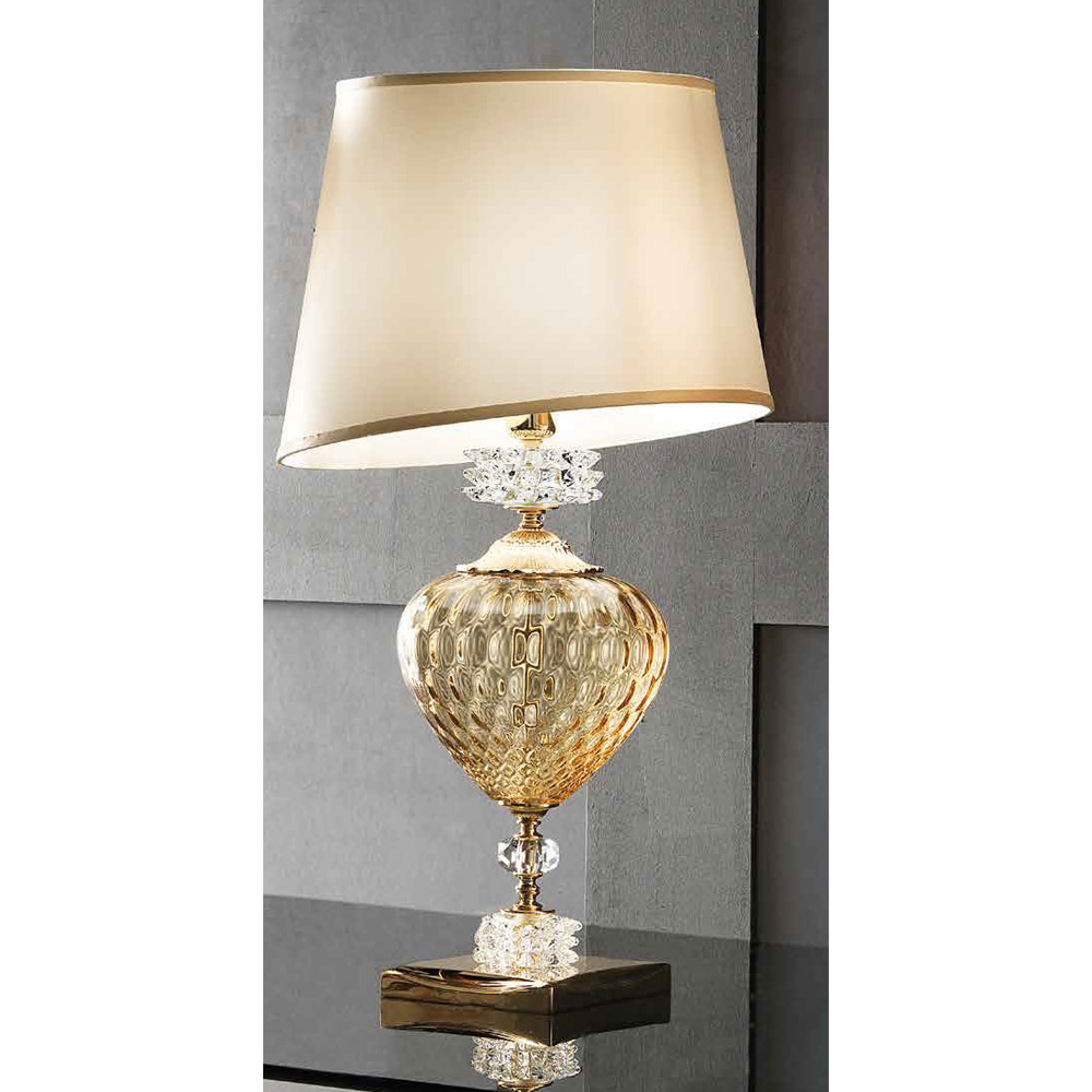 - Lichaam van transparant glas - details van honingglas - glanzend goudkleurig metaal en champagnekleurige lampenkap.