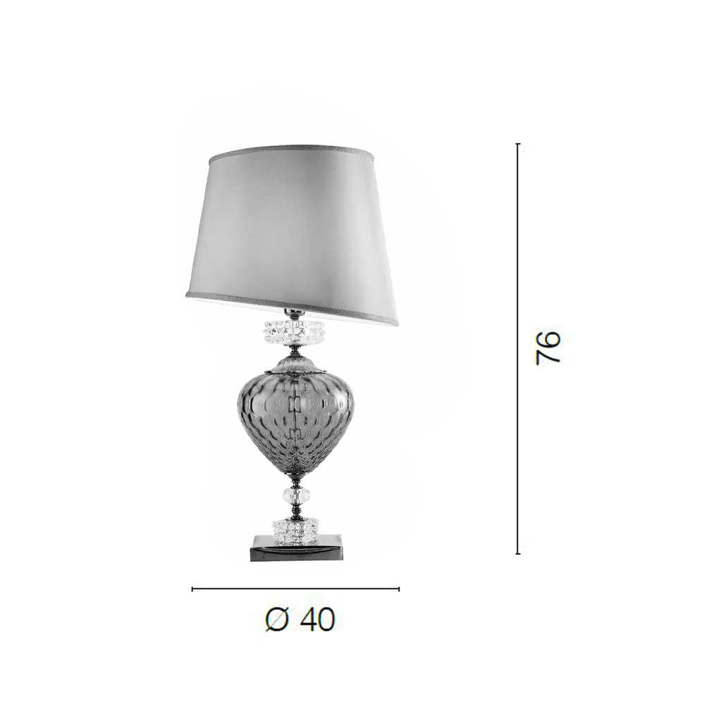 Beschikbare afwerkingen:- Gerookte glazen behuizing - transparante glazen details - gepolijst metaal en licht duifgrijze lampenkap;