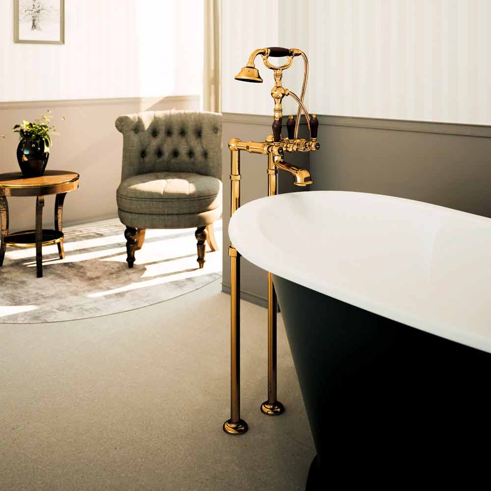 - Deluxe Gold: gepolijst 14 antiek gouden afwerking met witte keramische inzetstukken op de handgrepen;