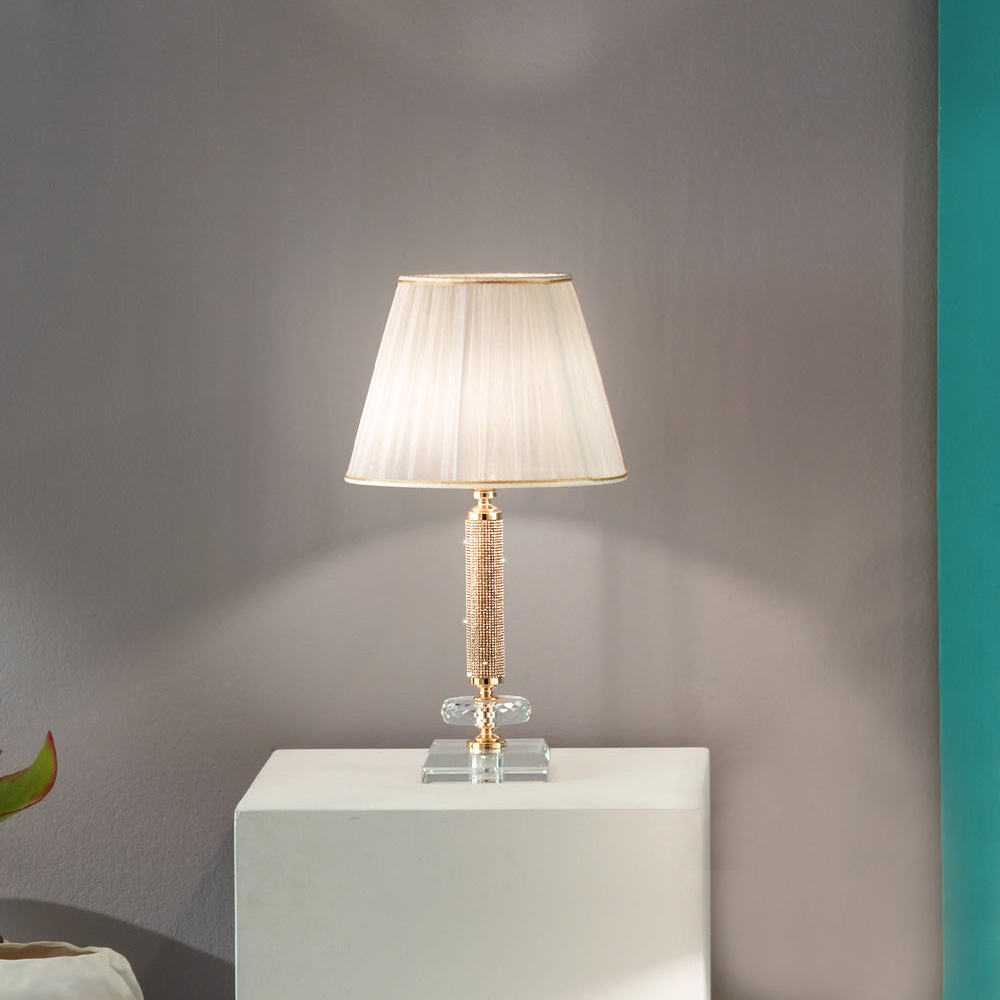 Het ontwerp wordt afgesloten met een lampenkap van stof met geplooid effect die zorgt voor zachte en gedempte verlichting; perfect voor zowel nachtkastjes in de slaapkamer als voor het bureau van een kantoor of woonkamer met een klassieke en elegante stijl.