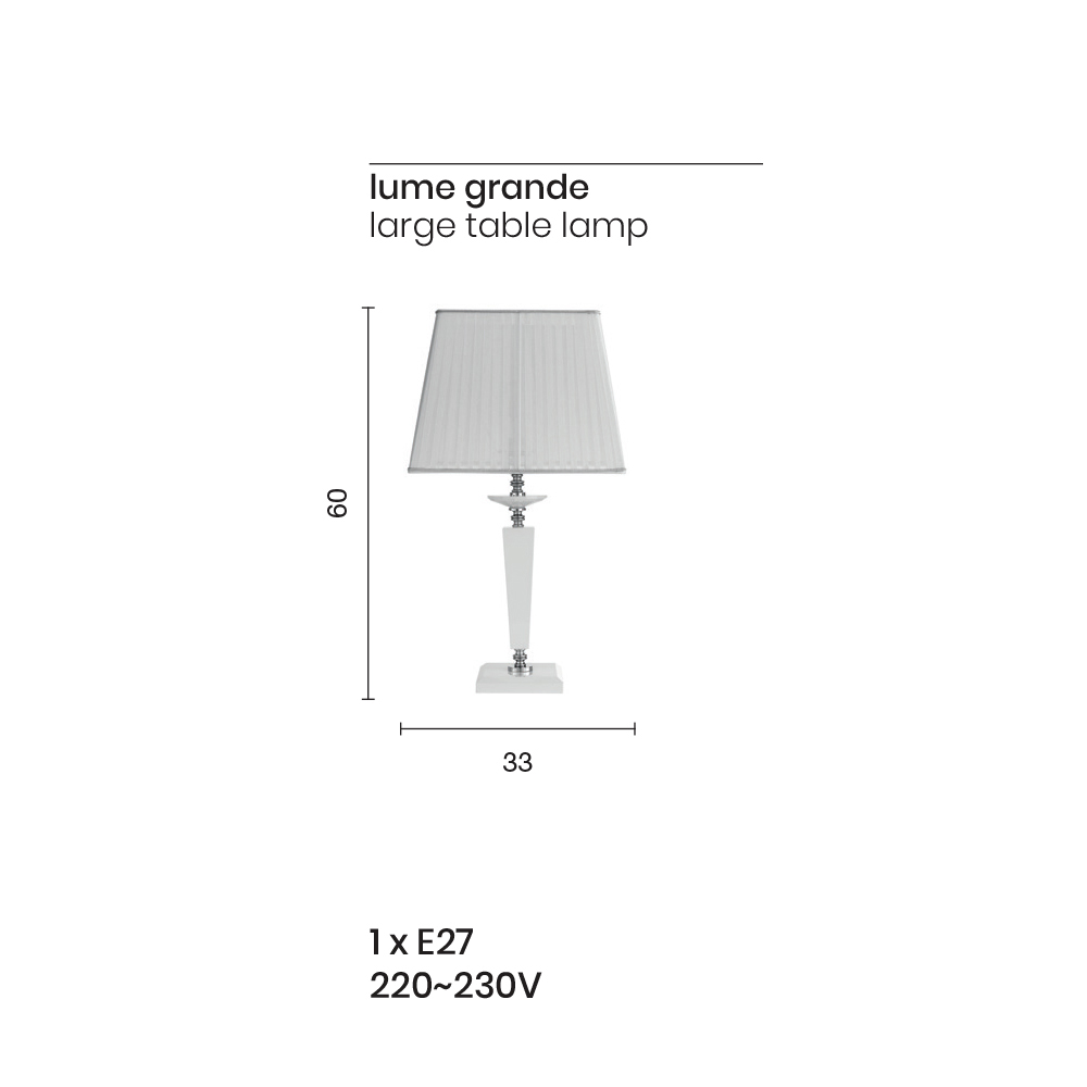 Deze tafellamp is in staat om de omgeving te karakteriseren en bestaat uit een witte vierkante voet , twee vierkante elementen van handgemaakt wit glas en een lampenkap van witte stof met een geplooid effect.