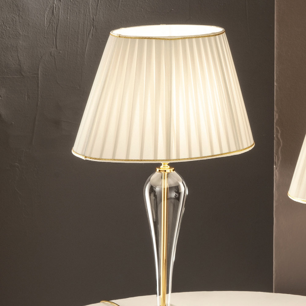 Gemaakt met een transparante kristallen voet en een cilindervormig element van handgemaakt transparant glas, de kleine details en de lamphouderafdekking zijn gemaakt van goudkleurig metaal ; de lampenkap is echter van geplooide stof met gouden afwerkingen.