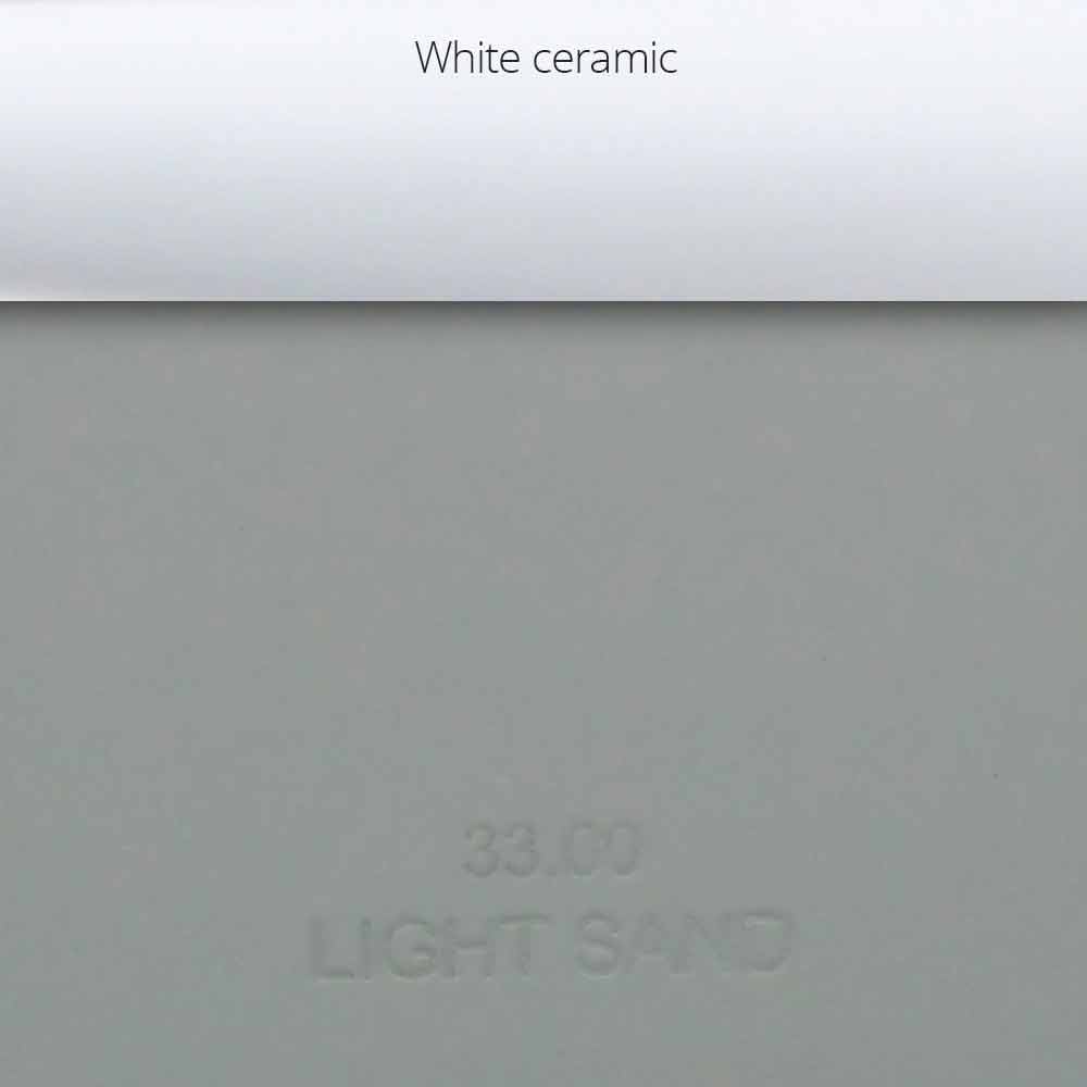 - Light Sand: ondoorzichtige warm lichtgrijze afwerking met witte keramische inzetstukken op de handgrepen;