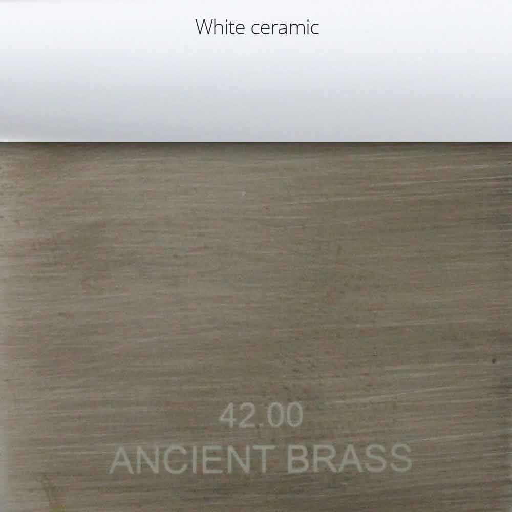 - Ancient Brass: mat geborsteld antiek messing afwerking met witte keramische inzetstukken op de handgrepen;