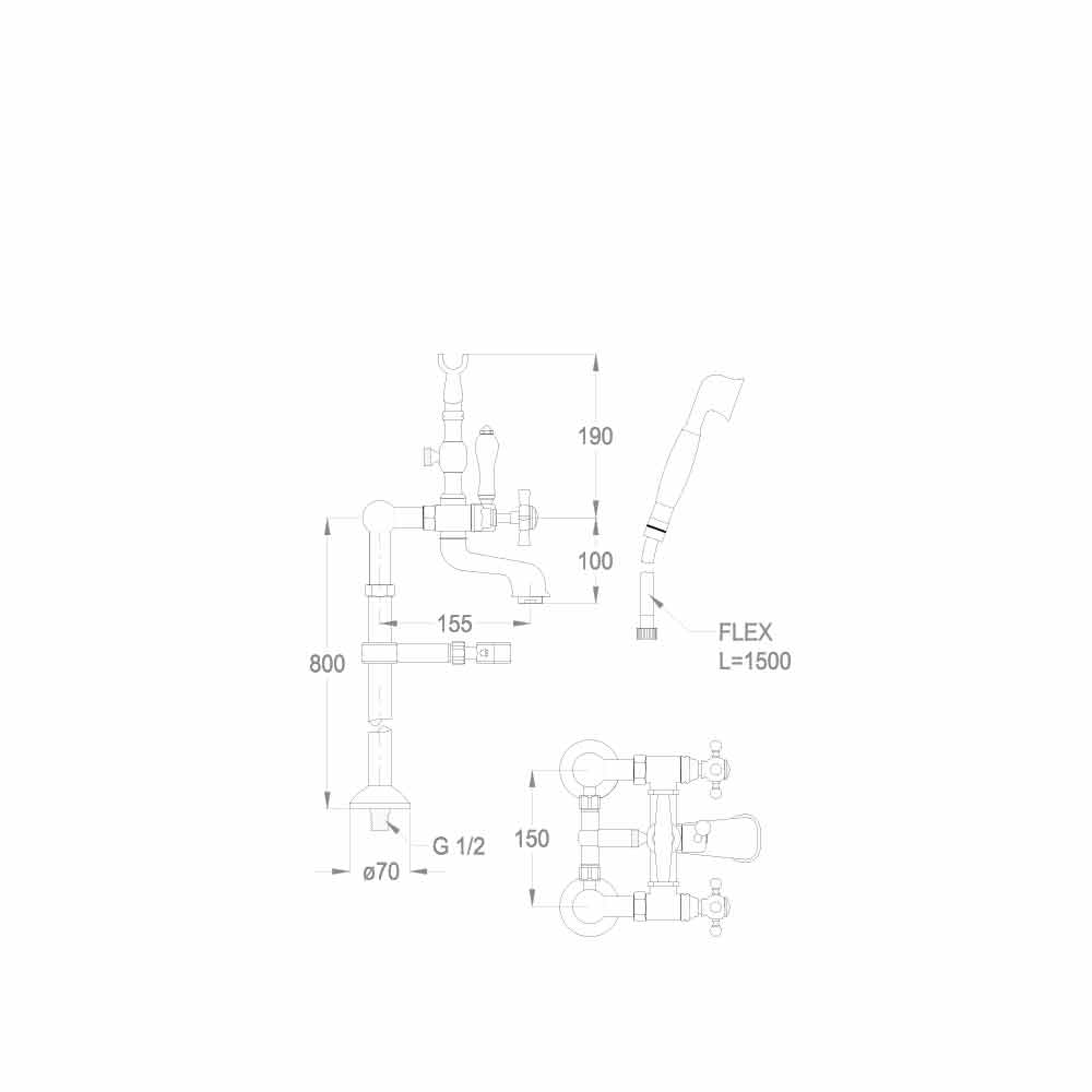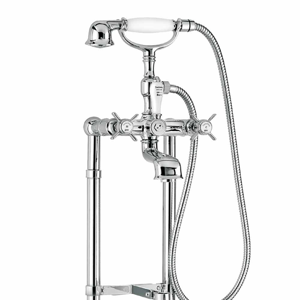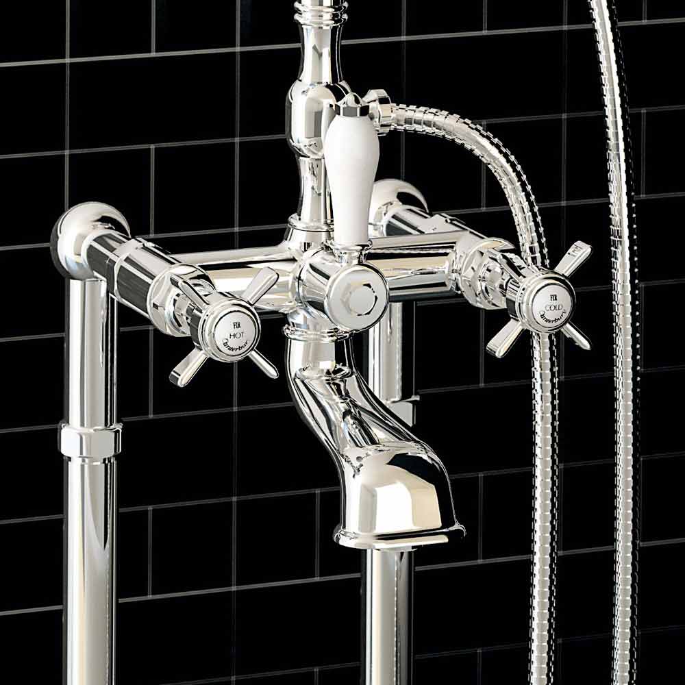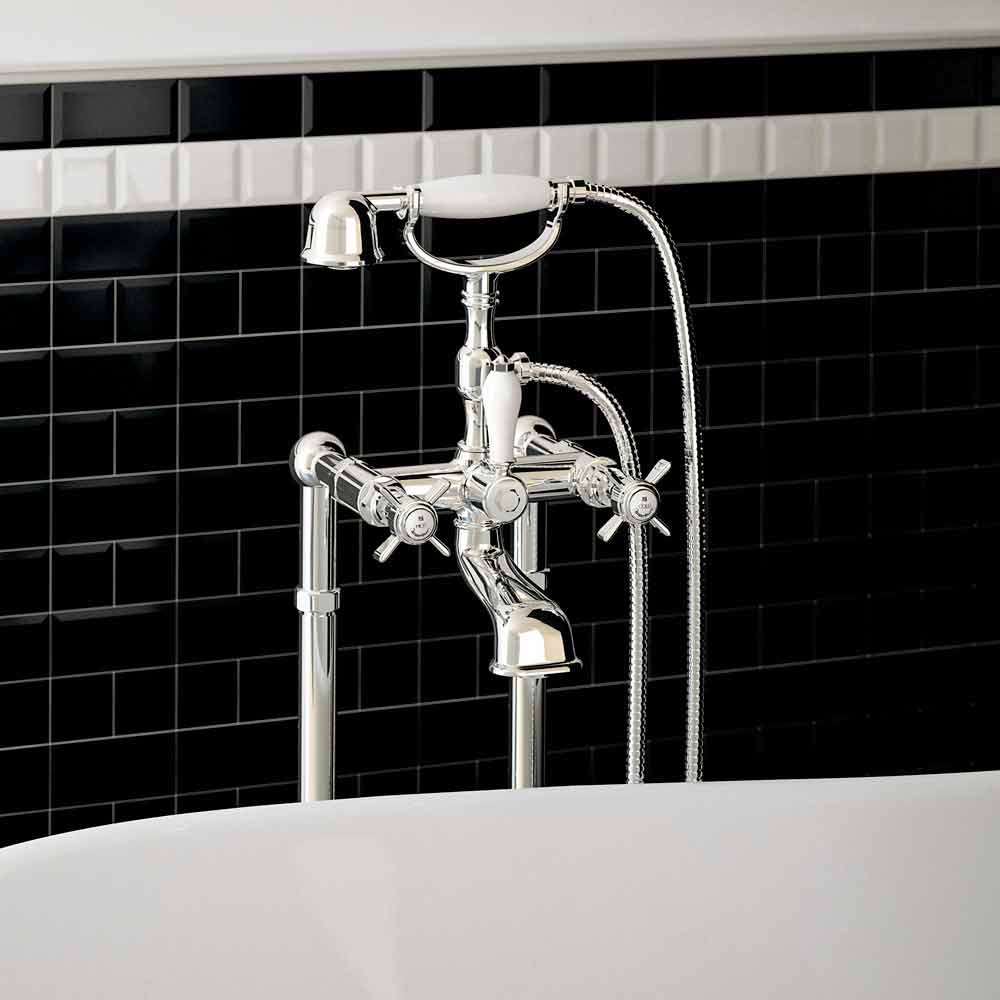 Externe badkraan op vloerkolommen met omstelling en duplexdouche Made in Italy.