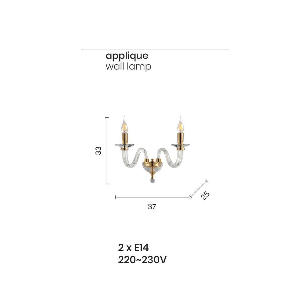 2-lichts wandlamp in handgemaakt glas en goud metaal, klassieke luxe made in Italy.