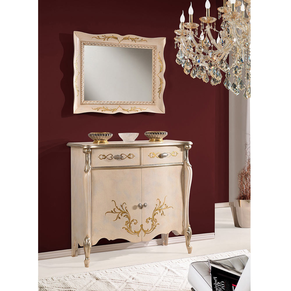 Woonkamer dressoir met een klassieke en elegante stijl compleet met 2 deuren en 2 praktische lades, verkrijgbaar in Bassano walnoot en antiek goud of antiek witte afwerking met inleg. Een unieke en verfijnde aanvulling, volledig