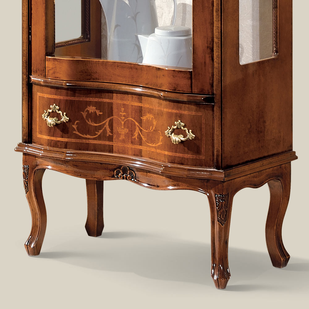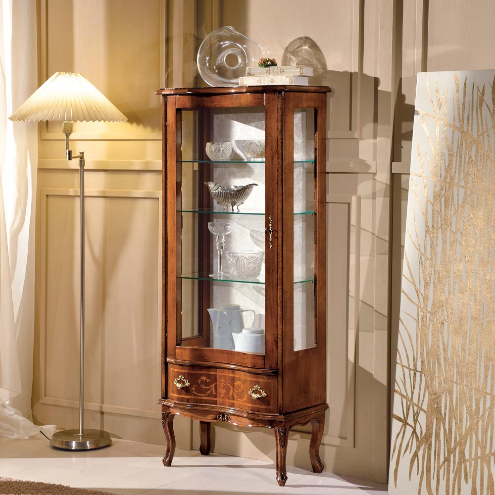 Klassieke woonkamervitrine in walnoothout met deur en lade Made in Italy.