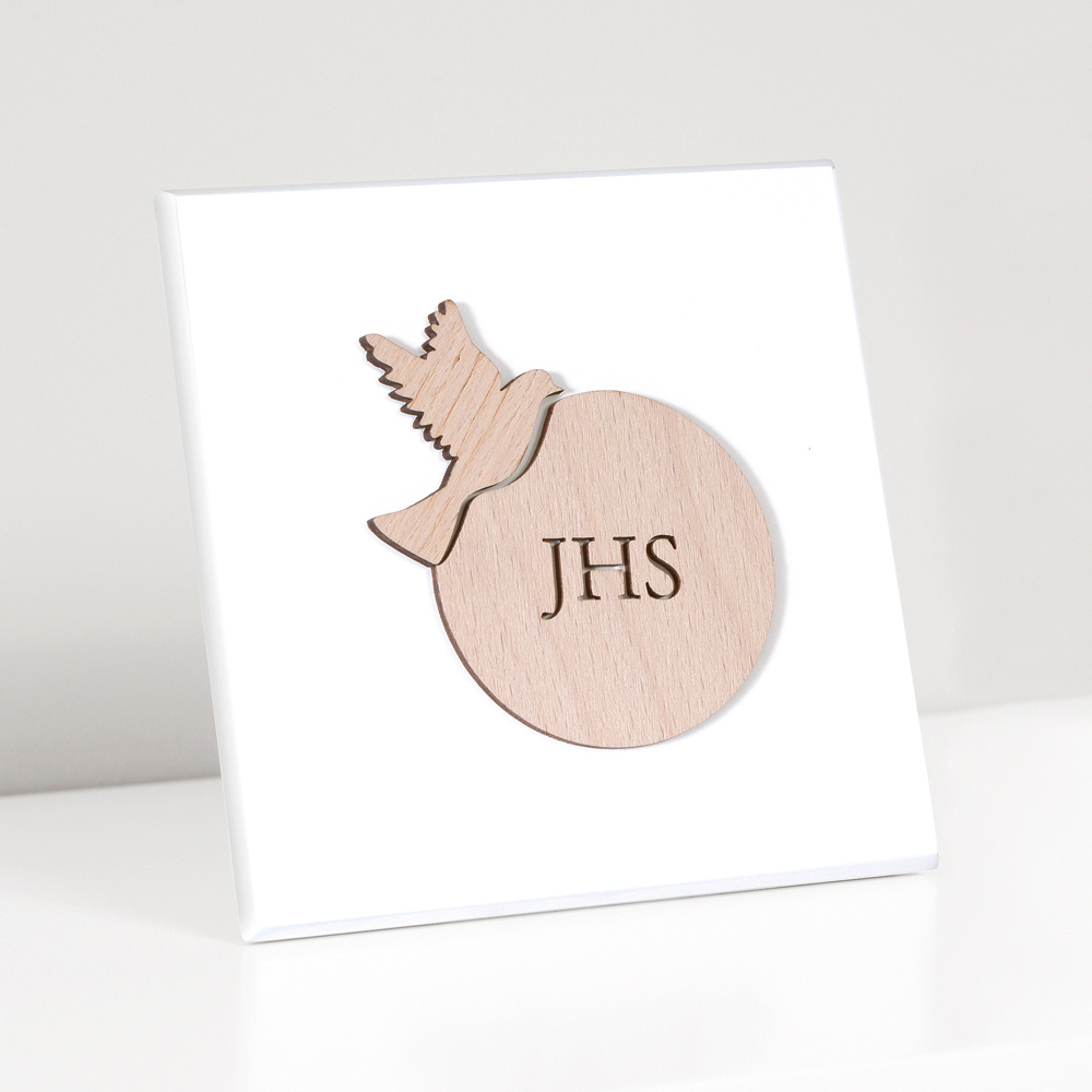 Heilig beeld met gastheer en bevestigingsduif in natuurlijk hout aangebracht. Wit gelakt houten paneel met steunvoet en gat om hem aan de muur te hangen.