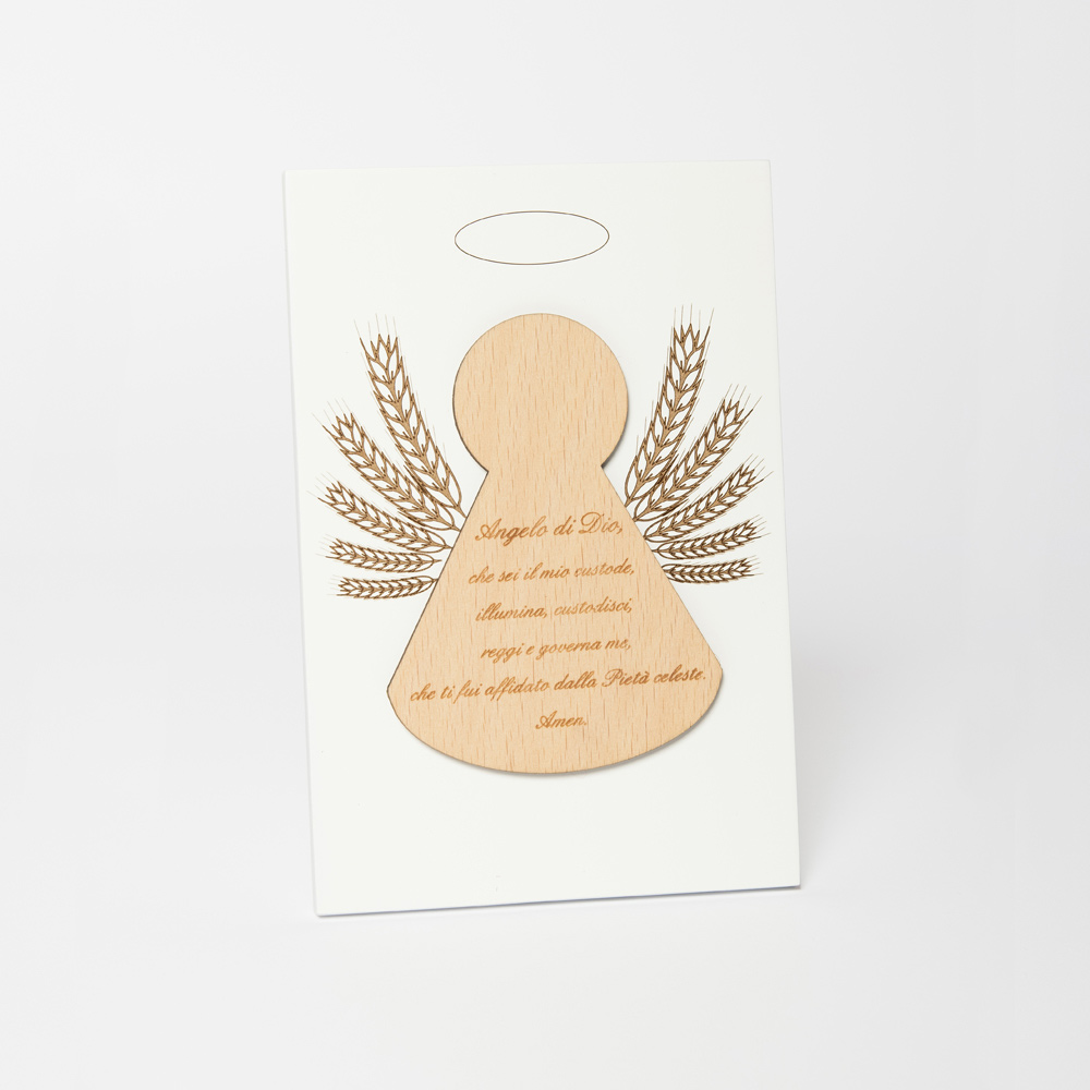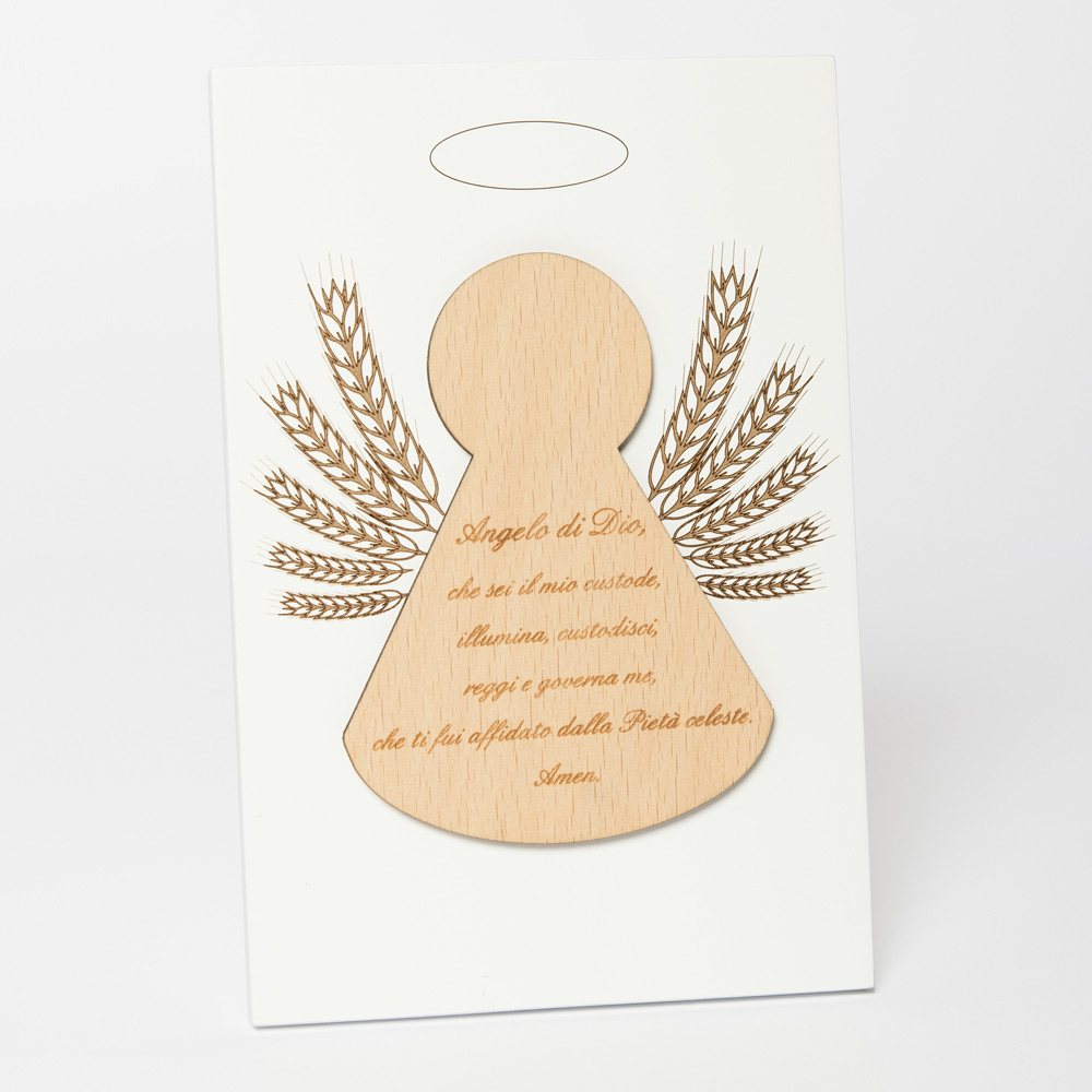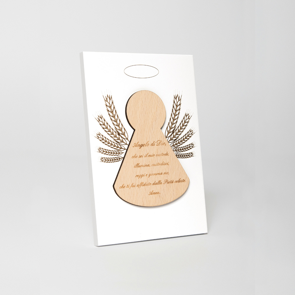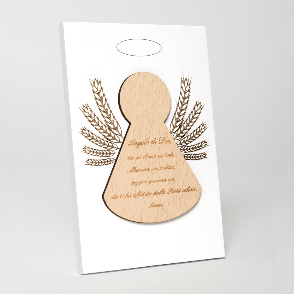 Heilige afbeelding met applicatie van een engel met gegraveerd gebed. Wit gelakt houten paneel met steunvoet. Toepassing in natuurlijk hout.