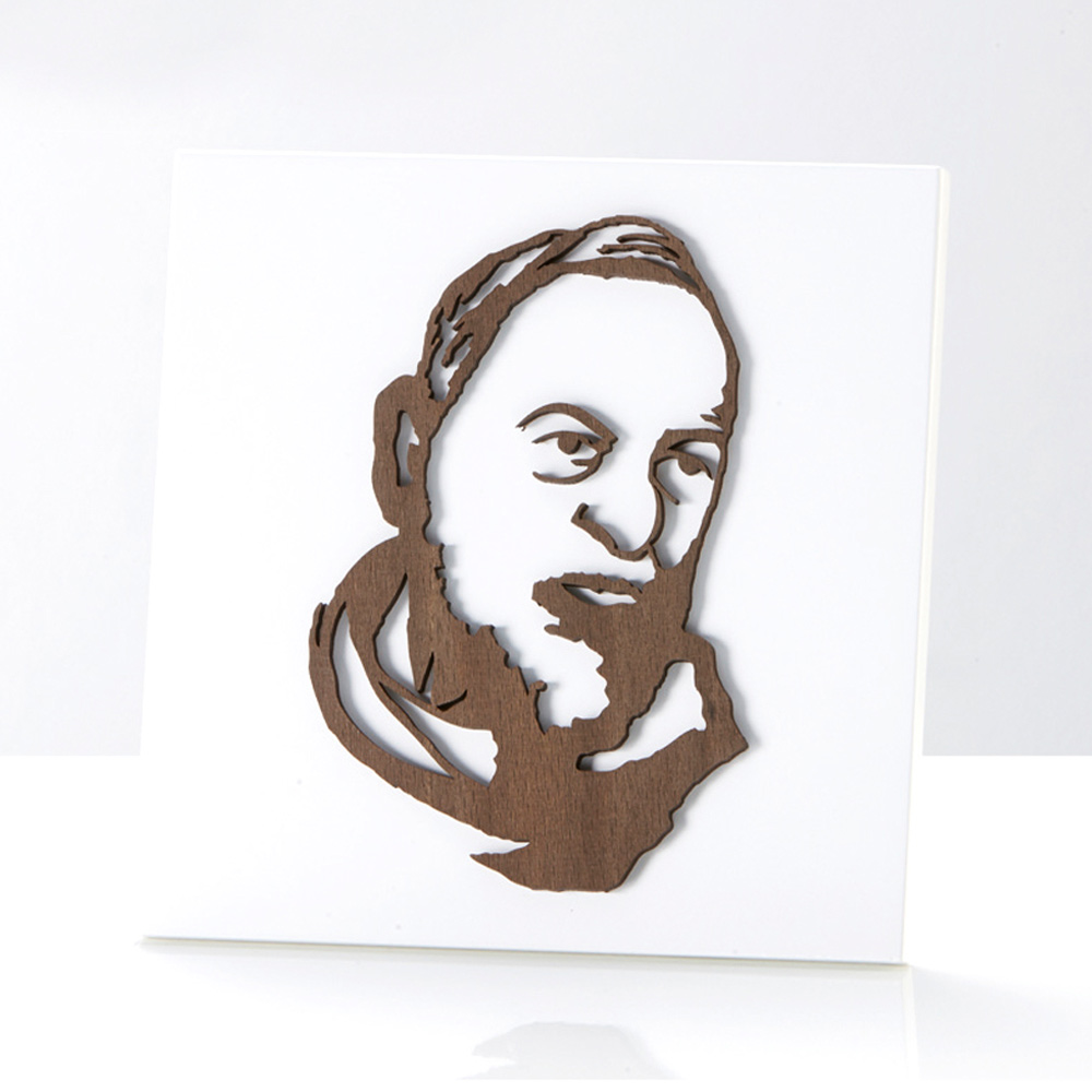 Heilig beeld met Pater Pio in wengé hout aangebracht. Wit gelakt houten paneel met steunvoet en gat om hem aan de muur te hangen.