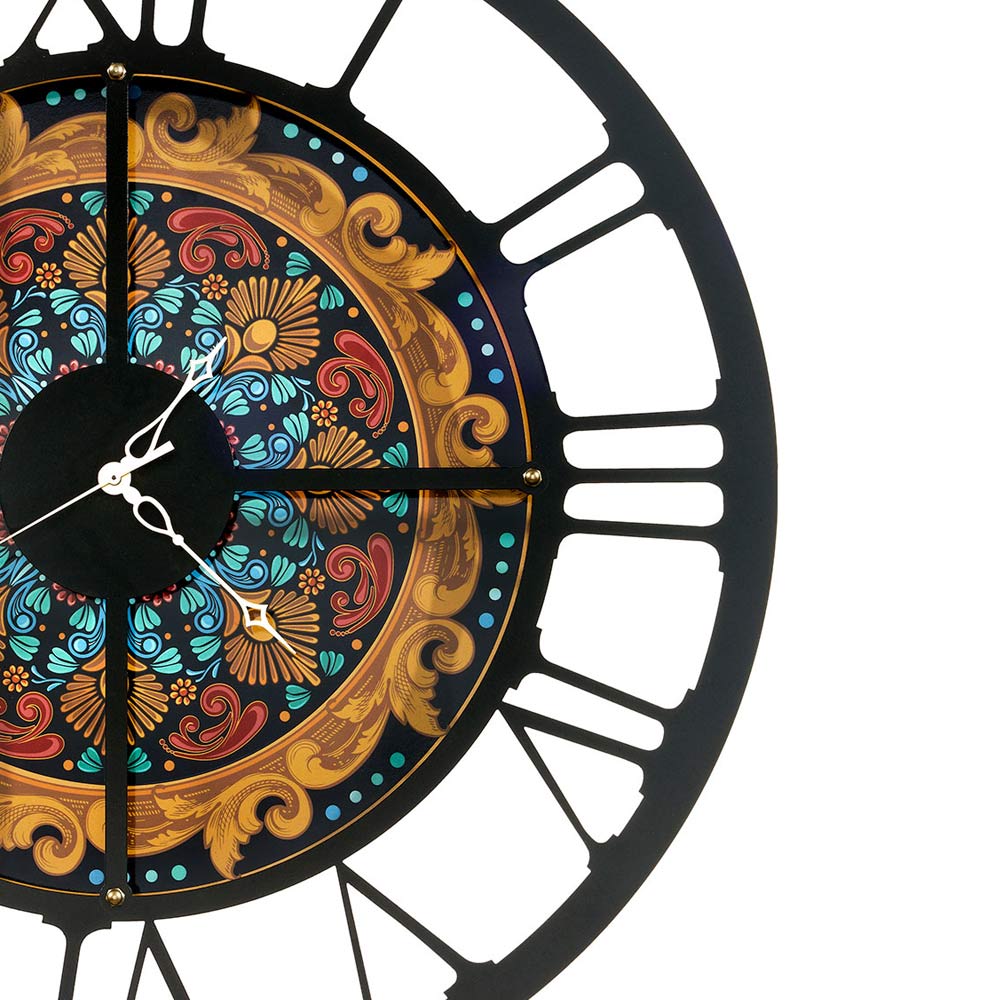 verfijnde en kleurrijke decoratie is zorgvuldig verdeeld over de wijzerplaat, waardoor deze een unieke uitstraling krijgt die de aandacht trekt van iedereen die de kamer binnenkomt. De patronen en tinten roepen een gevoel van kalmte en rust op, maar ook energie en vitaliteit.