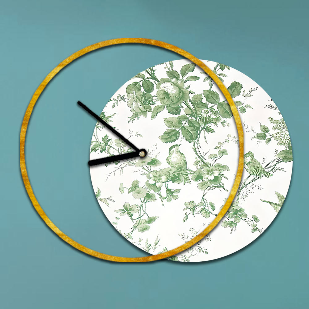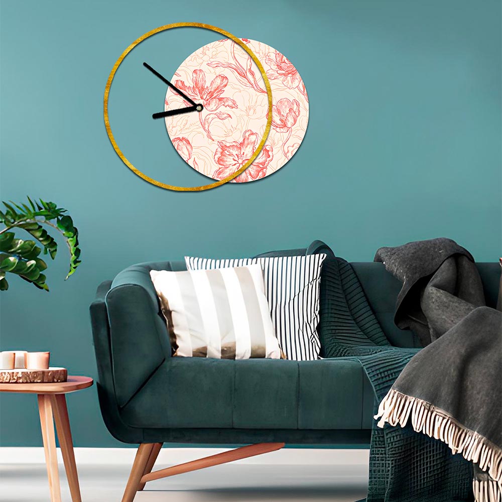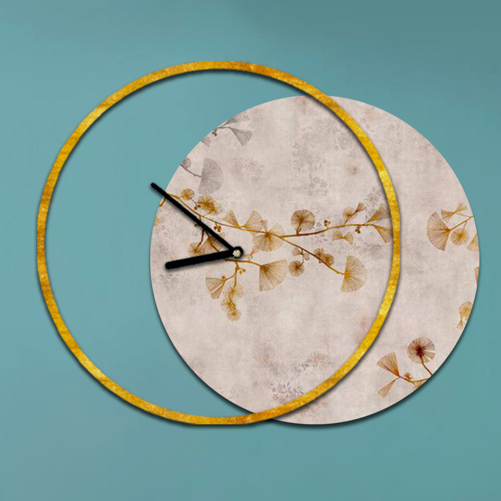 - bladgouden klok en print met takken en bloemen in roze/oker tinten