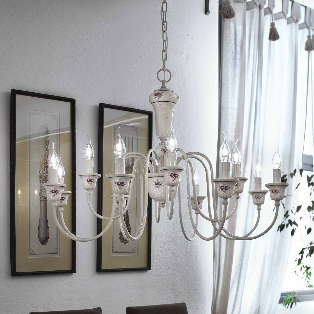 Deze kroonluchter met 12 lichtpunten is volledig handgemaakt in geverfd messing en keramiek met handgeschilderde bloemendecoratie, om het vakmanschap en de handmatige vaardigheden van de ambachtslieden te benadrukken.