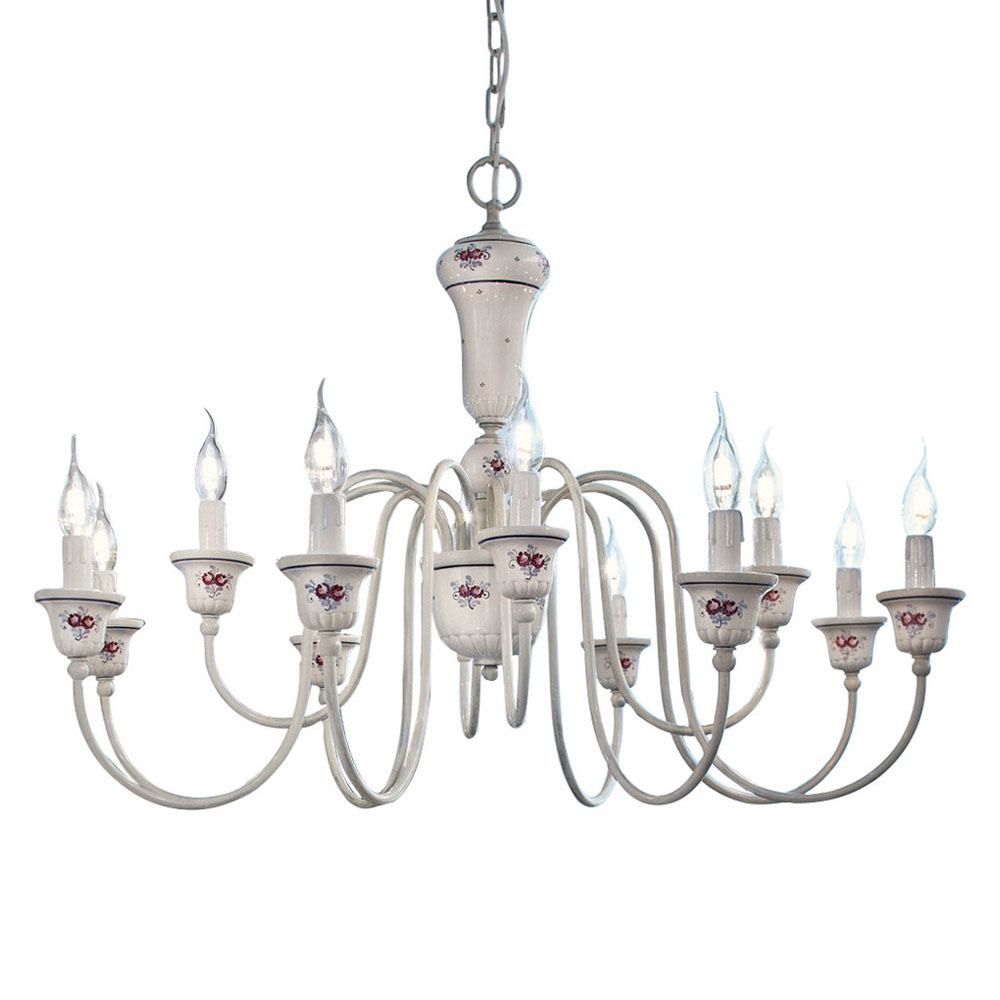 Handgemaakte 12-lamps messing en handgeschilderde keramische kroonluchter gemaakt in Italië door Ferroluce.