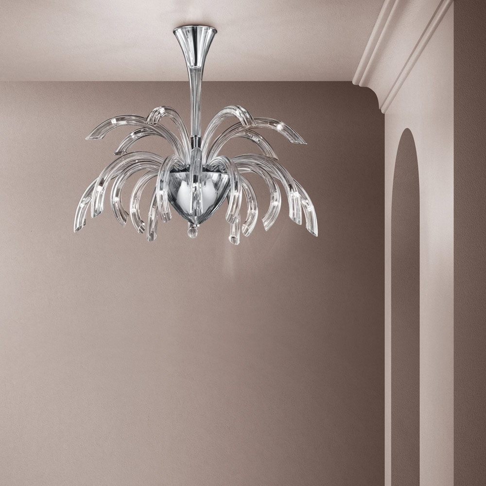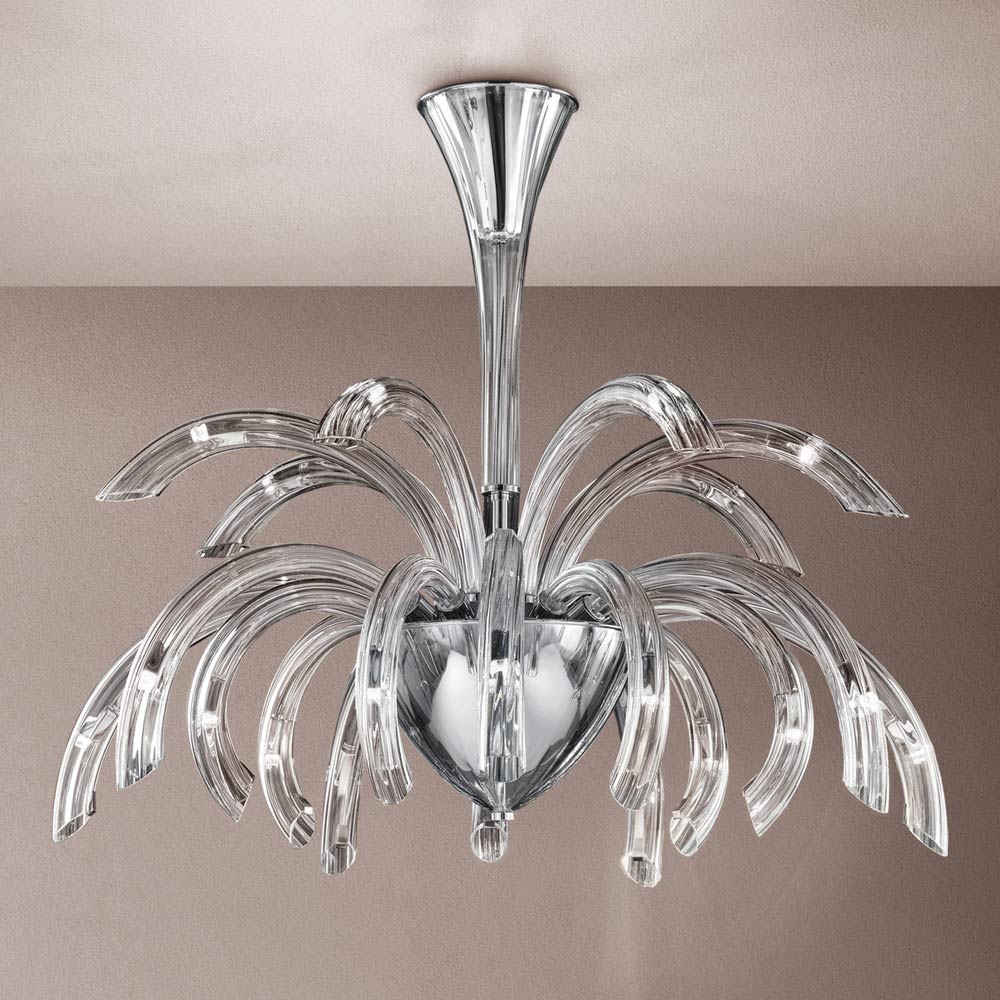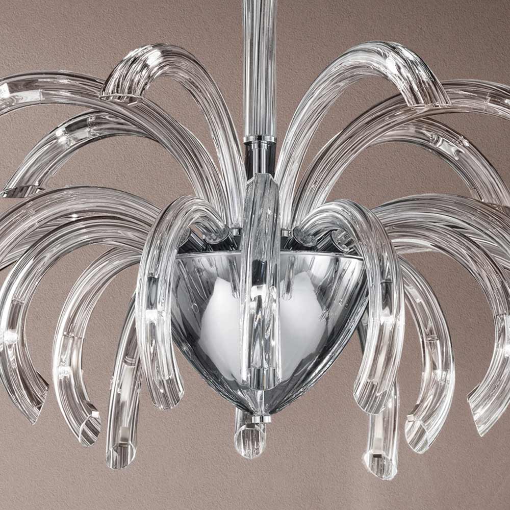 Kroonluchter met 21 lampjes gemaakt van handgemaakt glas van Venetië met kristalafwerking en verrijkt met details in verchroomd metaal . Een boeiende esthetiek die zich dankzij de vormen en de functionaliteit van het ontwerp met uitbundigheid aanpast aan elk type omgeving waarin het past. De prachtige en elegante gebogen armen breiden naar buiten uit om licht in verschillende richtingen te brengen en verlichten de kamer door een origineel scenografisch effect dat herinnert aan de explosie van vuurwerk voor een creatief , verfijnd en sterk visueel effect .