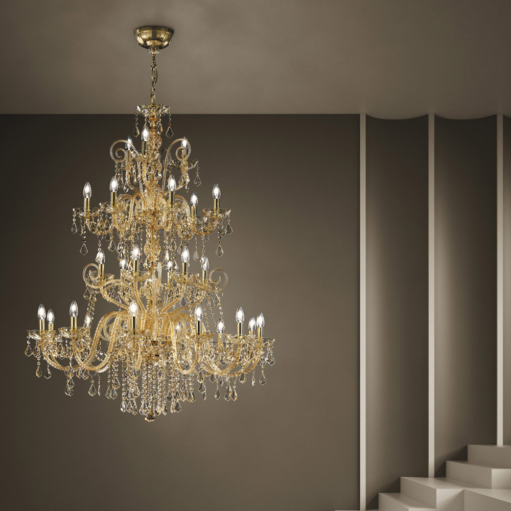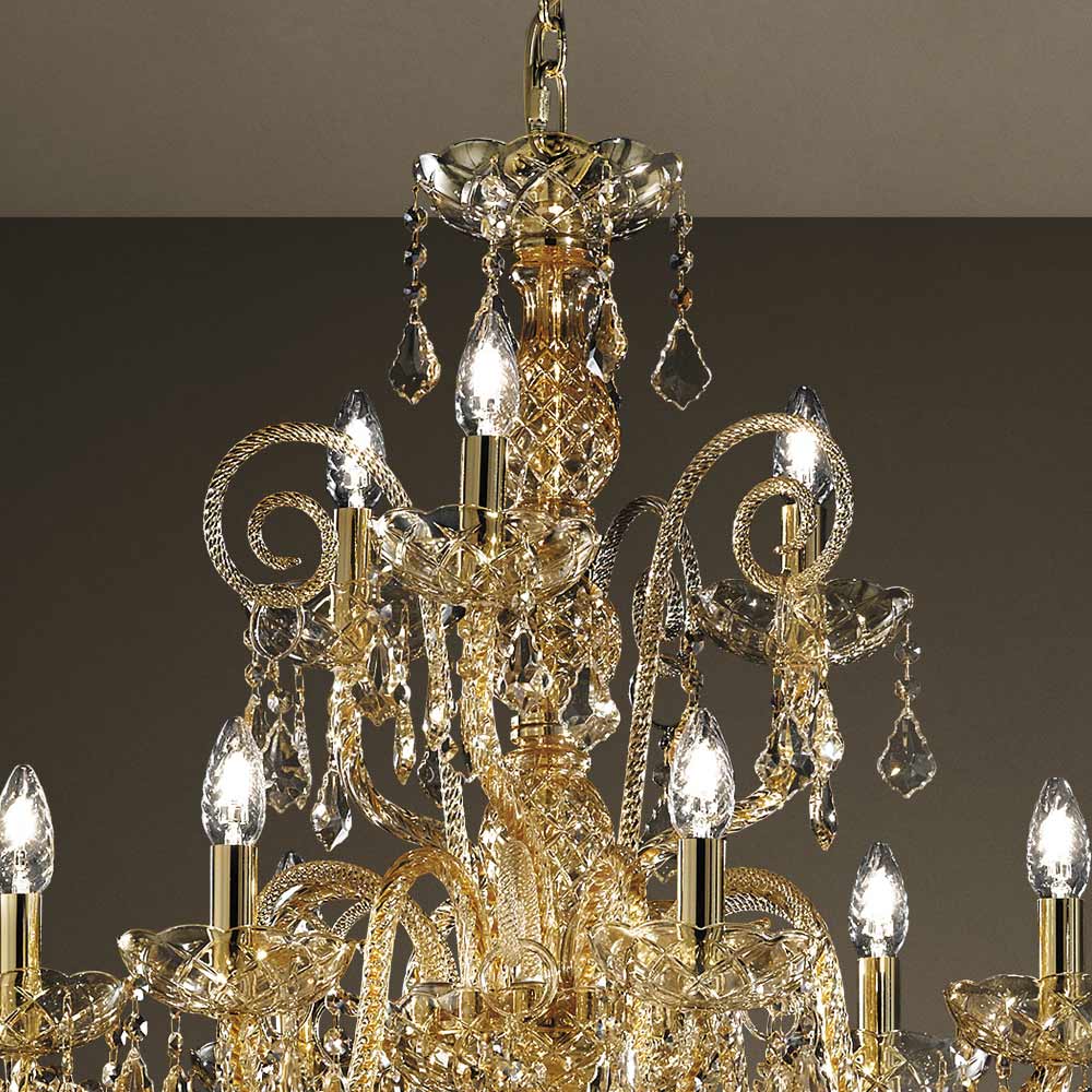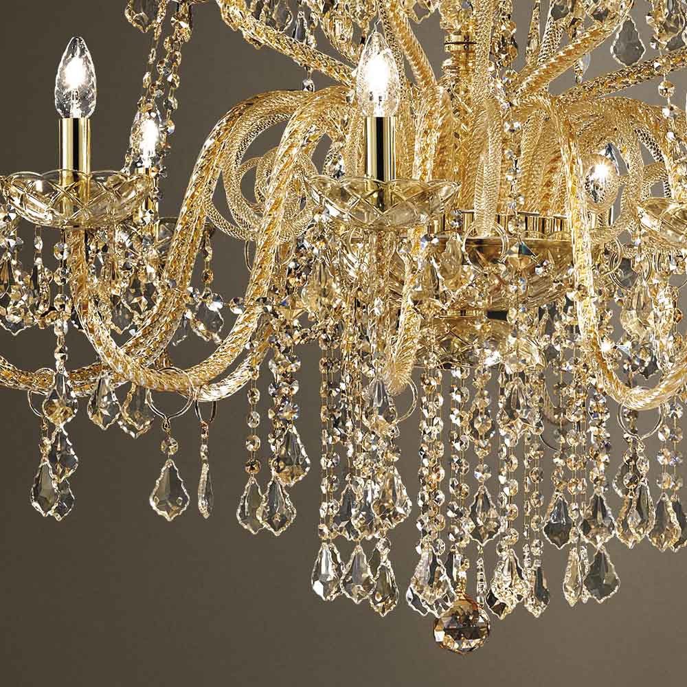 Kroonluchter met 27 lampjes gemaakt van Venetië glas met Amber decoratie afwerking met nationale hangers en details in glanzend goudkleurig metaal . Gemaakt door middel van vakmanschap , wordt deze aanvulling gekenmerkt door de prachtige armen die met de hand zijn bewerkt door middel van de draaitechniek, wat een exclusief resultaat creëert dat esthetisch herinnert aan de verstrengeling van een touw, waardoor de kroonluchter persoonlijkheid krijgt. Een echte lichtregen dringt de structuur van de kroonluchter binnen en verspreidt zich vervolgens in de omgeving door middel van breking door de magie van pailletten en kristallen hangers met fijne afwerkingen, waardoor een suggestief en dromerig scenografisch effect ontstaat dat betoverend en verrassend kan zijn. voor zijn elegantie en majesteit .