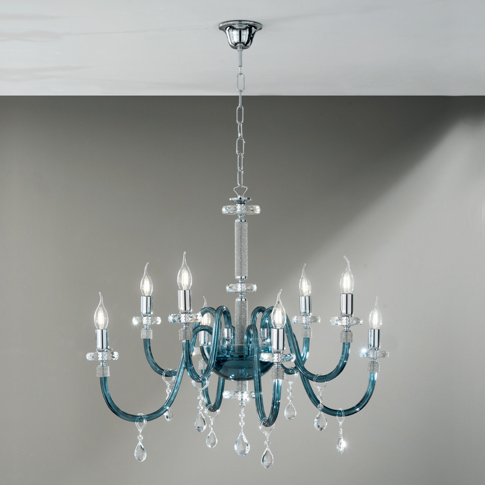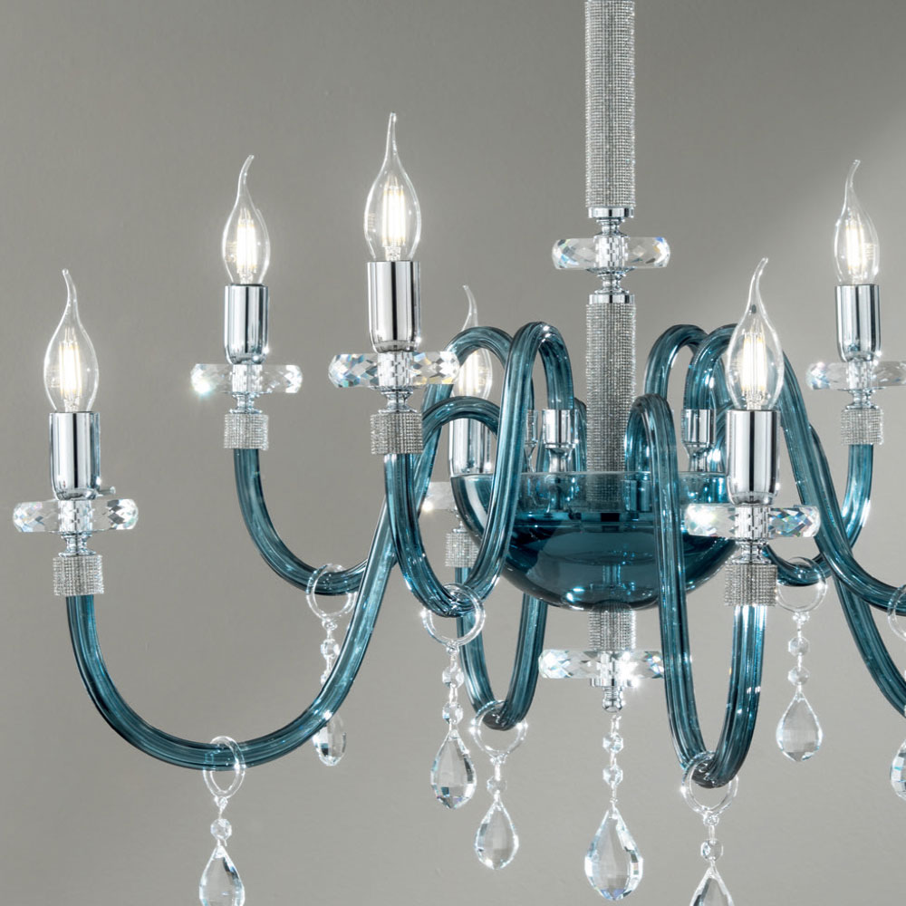 Deze hangende kroonluchter in klassieke stijl bestaat uit 8 gebogen armen van handgemaakt glas in Italië blauwgroen met "rigaton"-effect, waarvan het uiteinde is omgeven door glitters in het metaal, evenals het centrale deel van het complement , waar twee ronde schijven van buizen de structuur ondersteunen, afgewisseld met twee ronde schijven van verschillende afmetingen gemaakt van geslepen kristal.