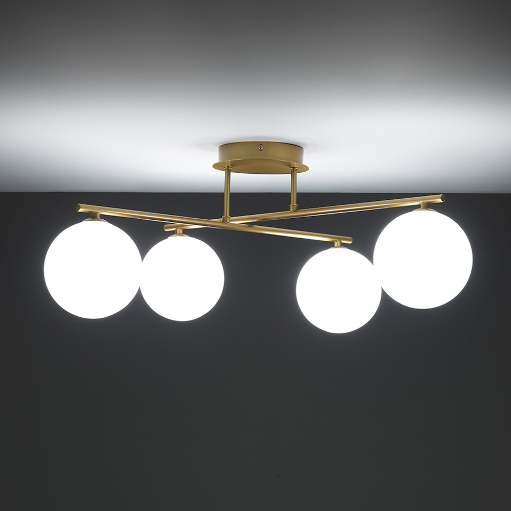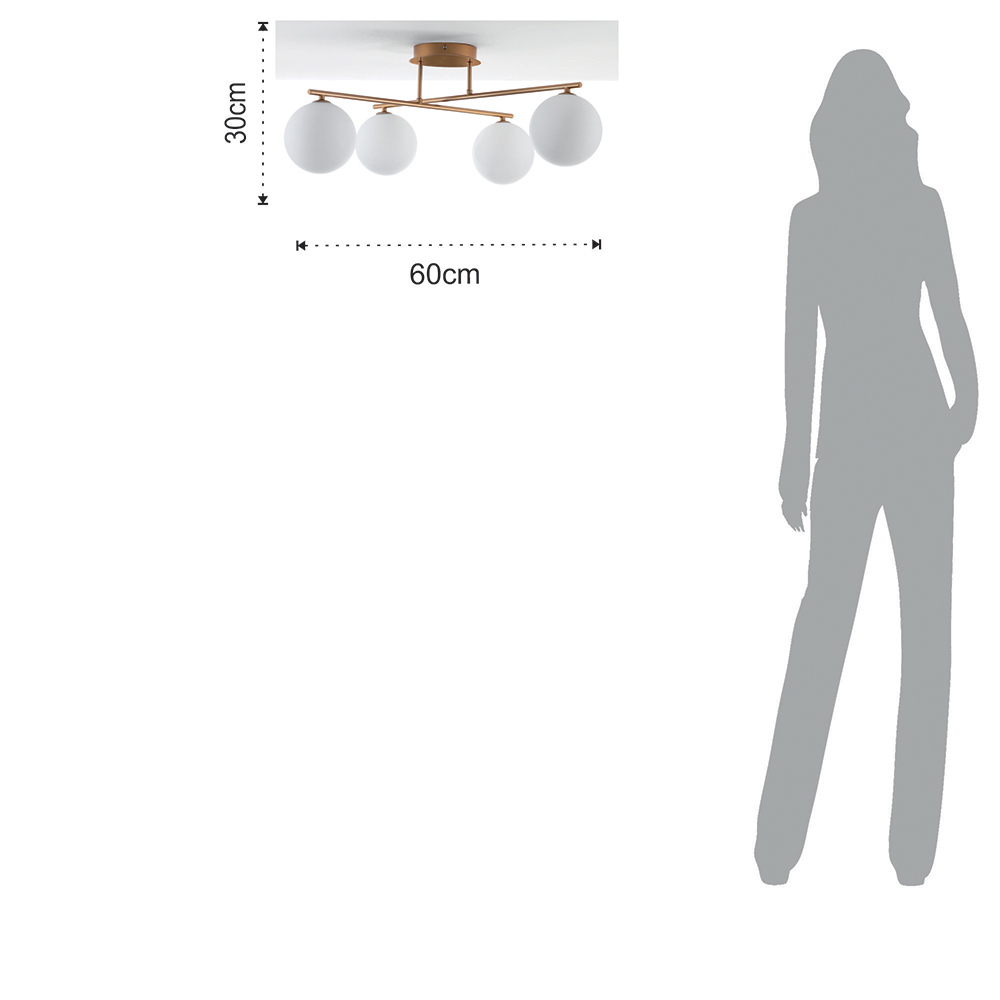 Deze kroonluchter is een uitstekend voorbeeld van elegant en modern design , ideaal om een vleugje stijl en verfijning toe te voegen aan elke omgeving. Met vier ondoorzichtige glazen bollen opgehangen aan een metalen structuur, creëert deze kroonluchter een diffuus en aangenaam licht, perfect voor omgevingen zoals de eetkamer, woonkamer of zelfs een inkomhal.
