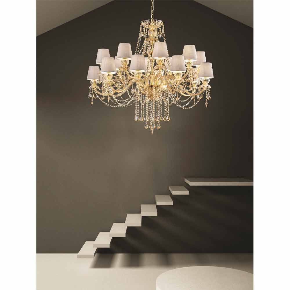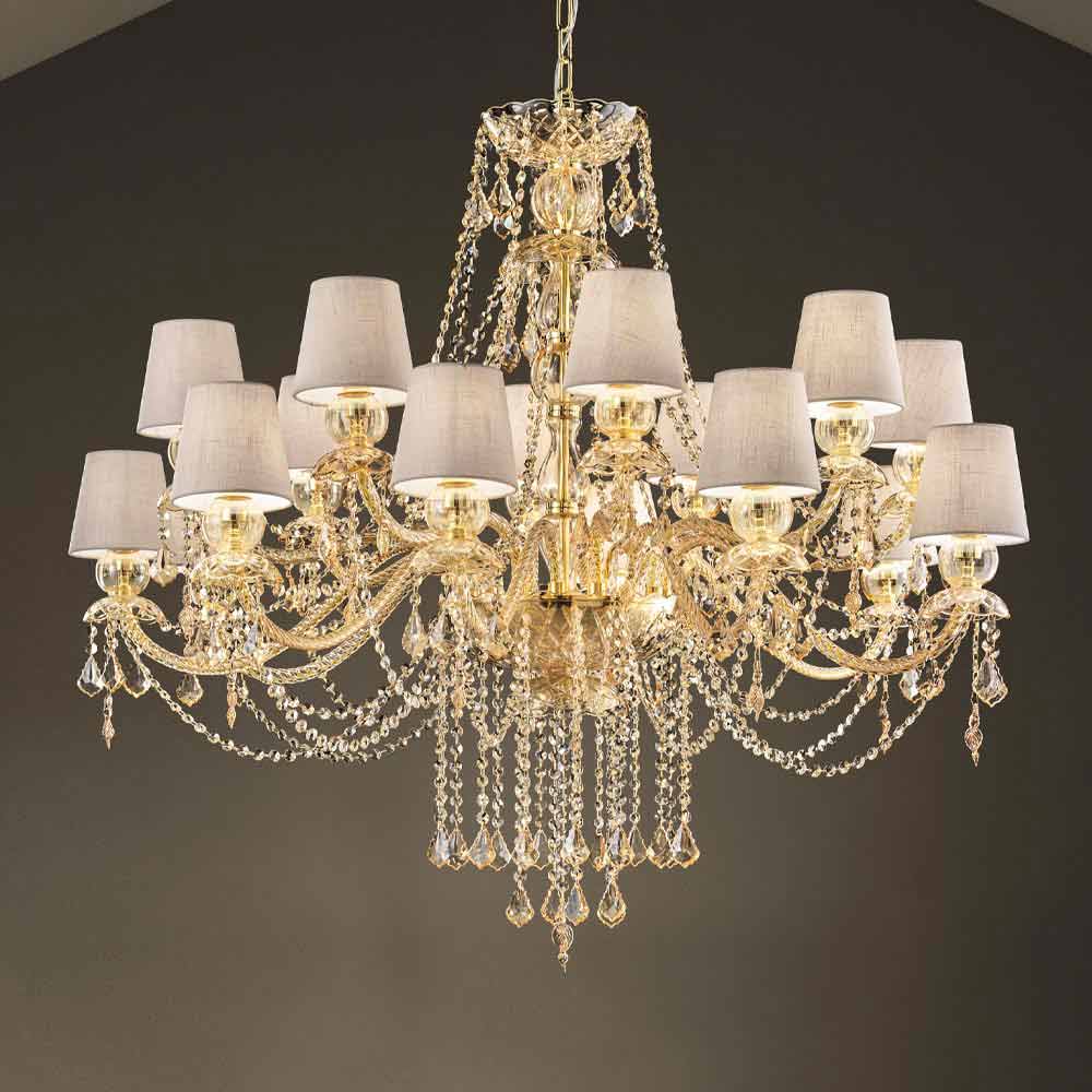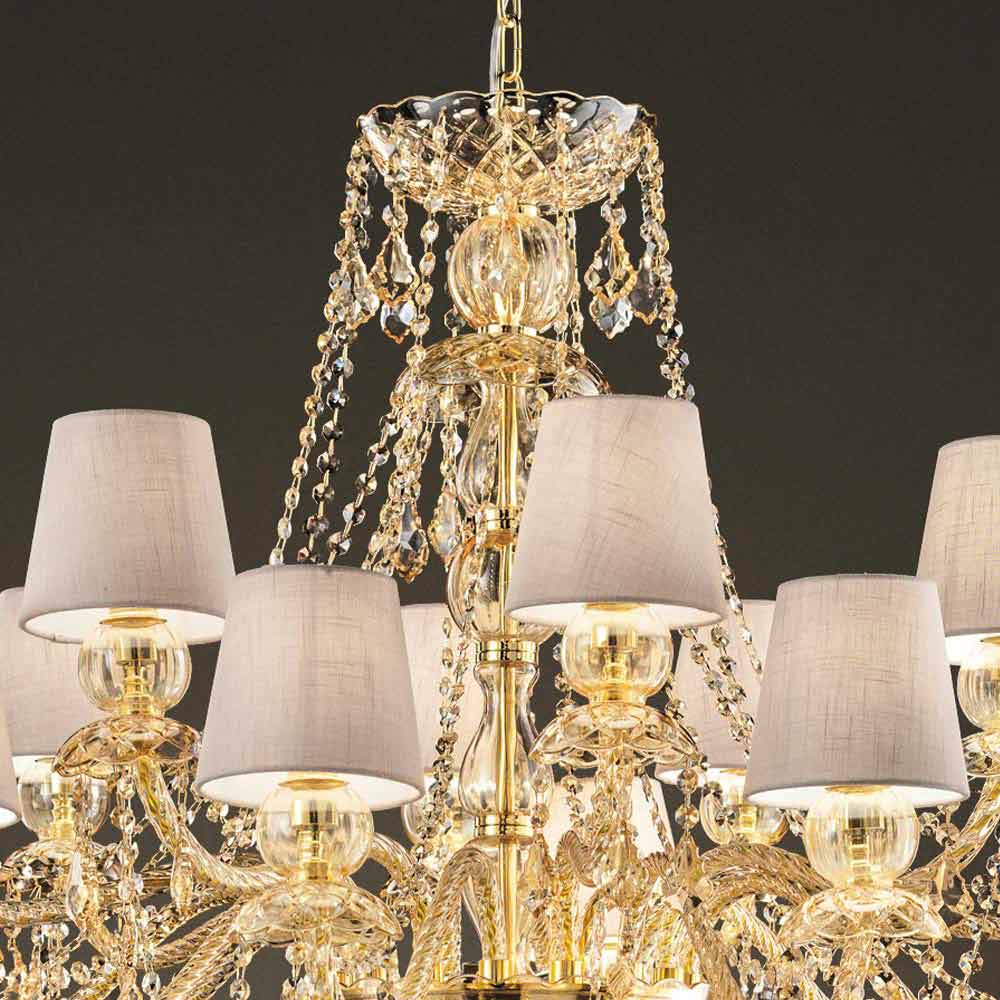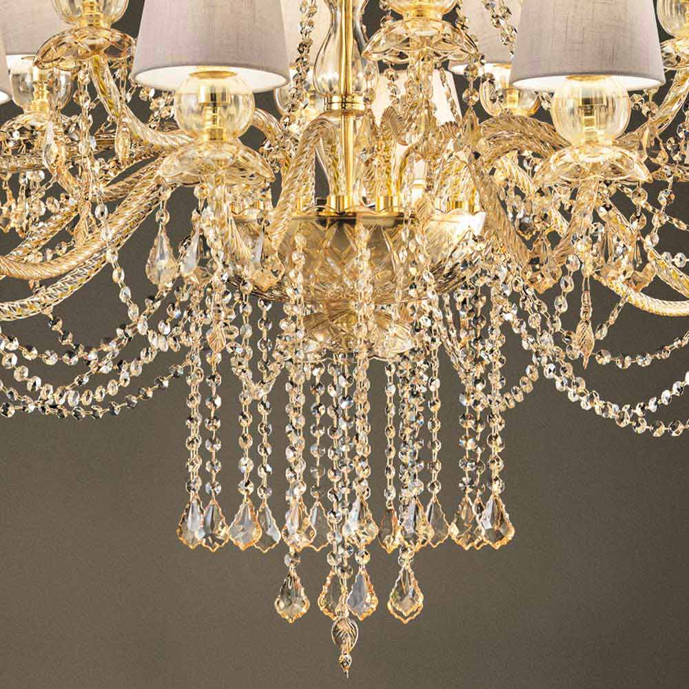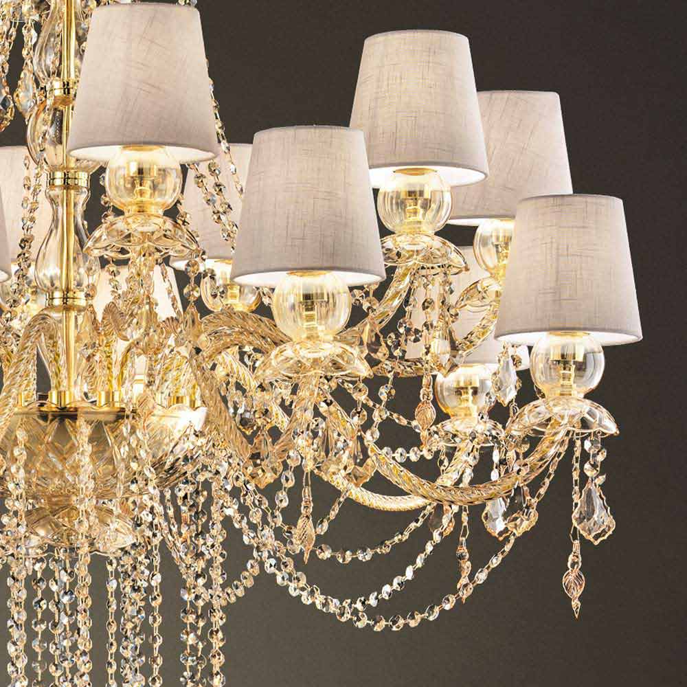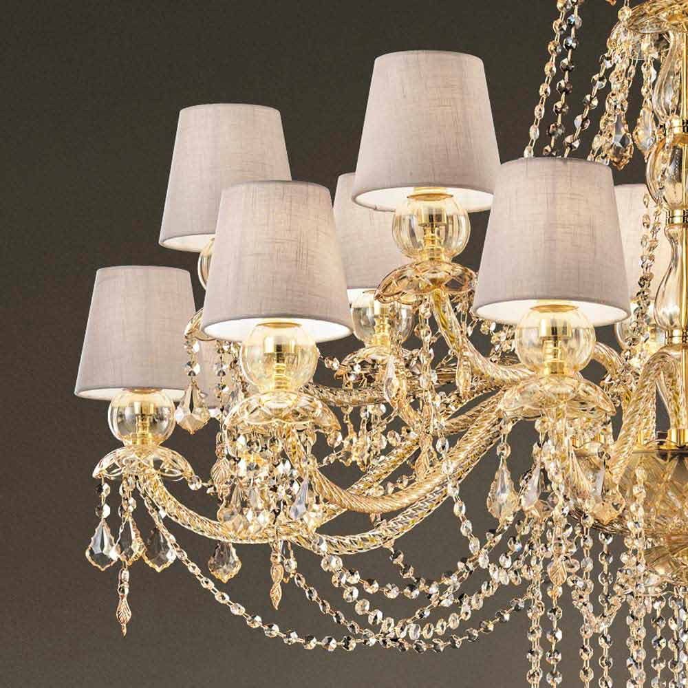 Verfijnde kroonluchter met amberkleurige afwerking Venetië-glasstructuur verrijkt met elementen in kristalafwerking, 16 linnen lampenkappen en glanzende gouden metalen details, handgemaakt in Italië . Lichtgevende hangers en fascinerende lampenkappen vertegenwoordigen de eigenaardigheden van dit prachtige meubelaccessoire met een romantische ziel die grote kamers kan vullen met persoonlijkheid en stijl met tijdloze elegantie . De esthetiek wordt uniek en interessant gemaakt door de vele pailletten die door de breking van het licht gekleurde lichtstralen en een verfijnd spel van licht en schaduw creëren voor een kroonluchter met een sterke scenografische impact .