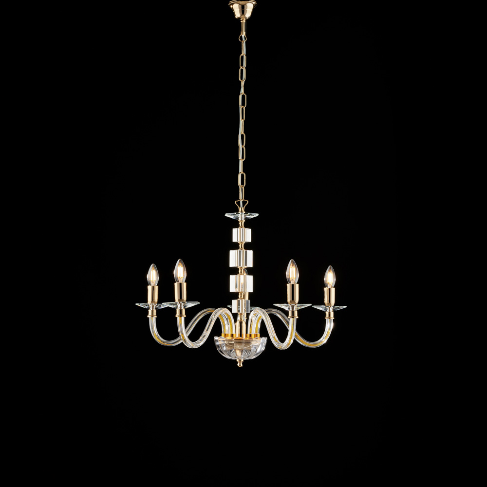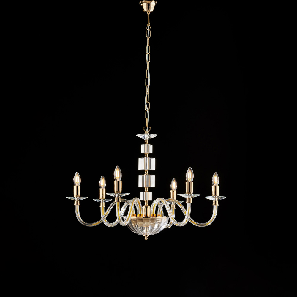 Dramatisch en verfijnd, deze luxueuze gouden kroonluchter met helder glas en strass-steentjes is een zeer prestigieuze lichtcreatie die elke ruimte met tijdloze elegantie kan verfraaien. De klassieke structuur met gebogen, kaarsvormige armen is verrijkt met elementen van helder glas en details van strass-steentjes , die het licht vermenigvuldigen en schitterende en verfijnde reflecties creëren.
