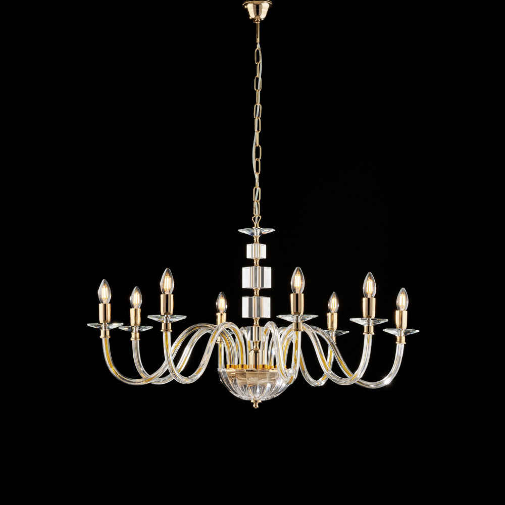 De afwerking in kristal/gepolijst goud versterkt de helderheid van de kroonluchter en benadrukt de harmonieuze vormen, waardoor deze ideaal is voor statige woonkamers , elegante eetkamers , klassieke salons , luxe hotels en hoogwaardige projectinrichtingen . Elk detail getuigt van de uitmuntende kwaliteit van Italiaans vakmanschap .