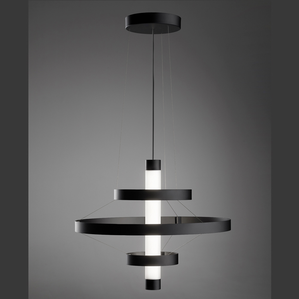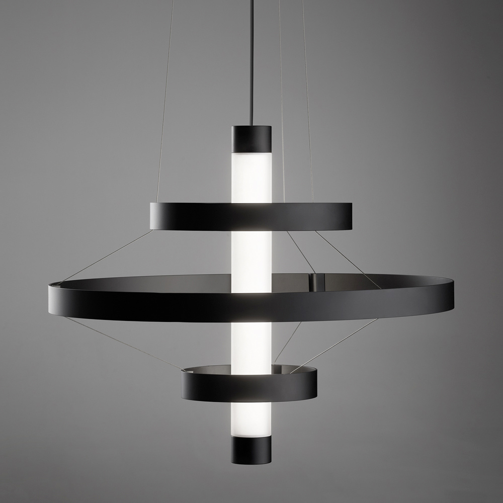 Binnenkroonluchter met een centraal glazen lichaam, het middelpunt van licht en energie, waaromheen een reeks ringen van verschillende groottes zijn aangebracht die in de ruimte lijken te zweven, gemaakt van aluminium.